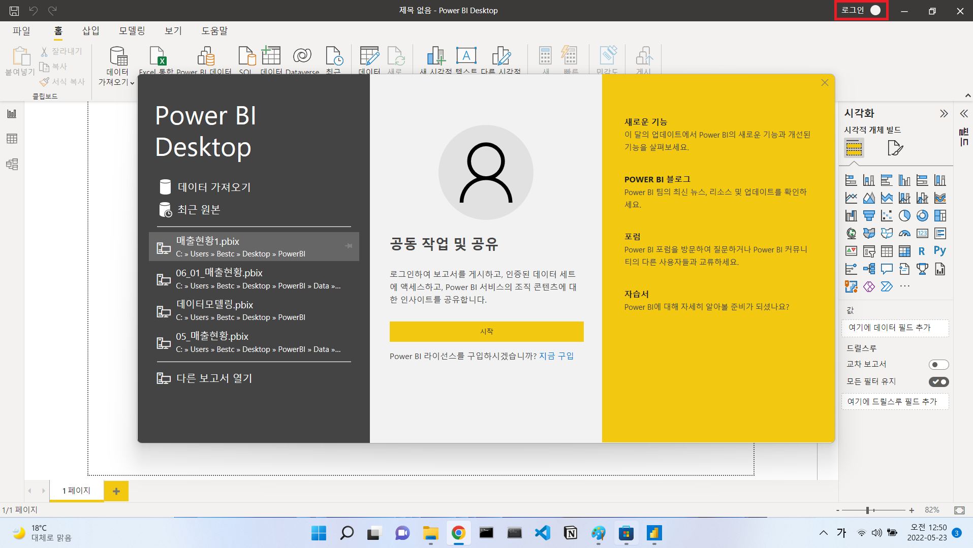 설치방법은 상기 내용과 같으며, Microsoft 등록계정이 있으면 로그인 후 사용할 수 있습니다. 로그인 시, 웹 게시를 통한 보고서 공유 및 추가적인 시각적 개체 사용이 가능하니 해당 부분에 관심이 있으신 분들은 로그인 후 사용하시면 좋을 것 같습니다. (+ 홈페이지에 직접 접속 후 다운로드도 가능합니다.)