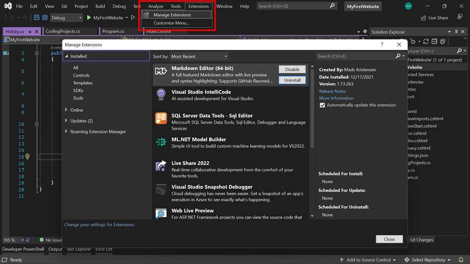 4. 확장 : Visual Studio Marketplace를 통한 다양한 확장기능 제공(예시 : SQL Server Data Tools)