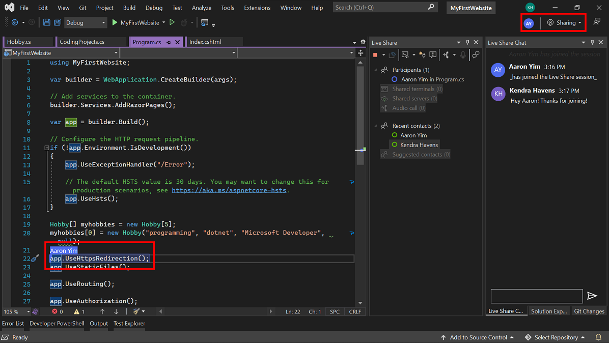 5. Live Sharing과 페어링 : Live Share를 통한 링크공유를 통해 다른 사용자와 공동 코드 편집 및 디버깅 가능