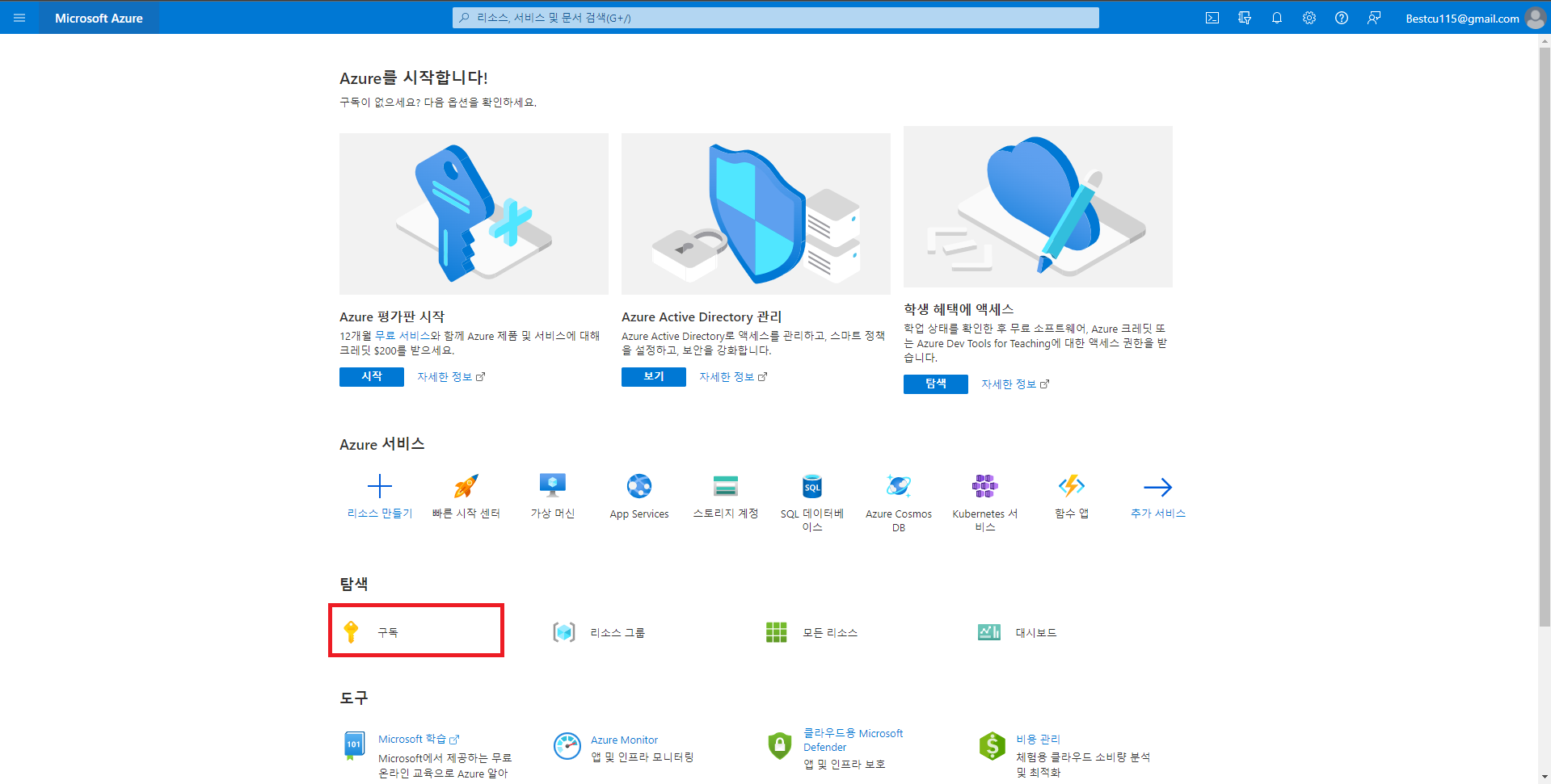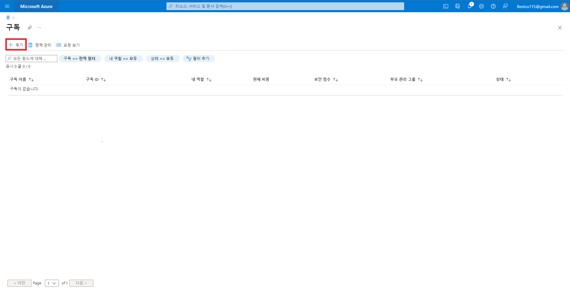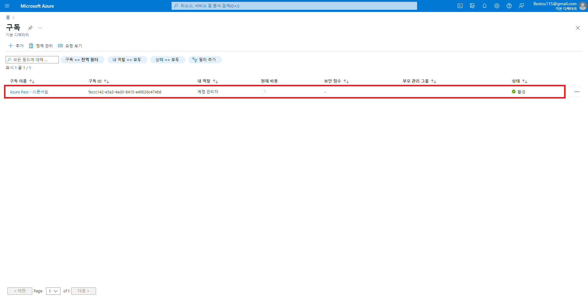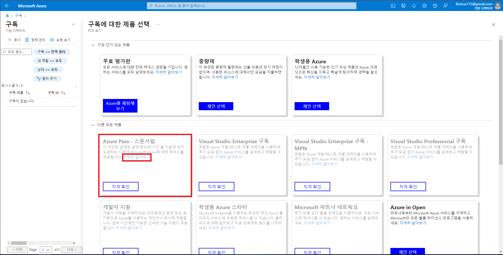 2. 구독을 클릭하여 구독 페이지로 이동 후 Azure Pass 등록할 수 있는 페이지로 이동