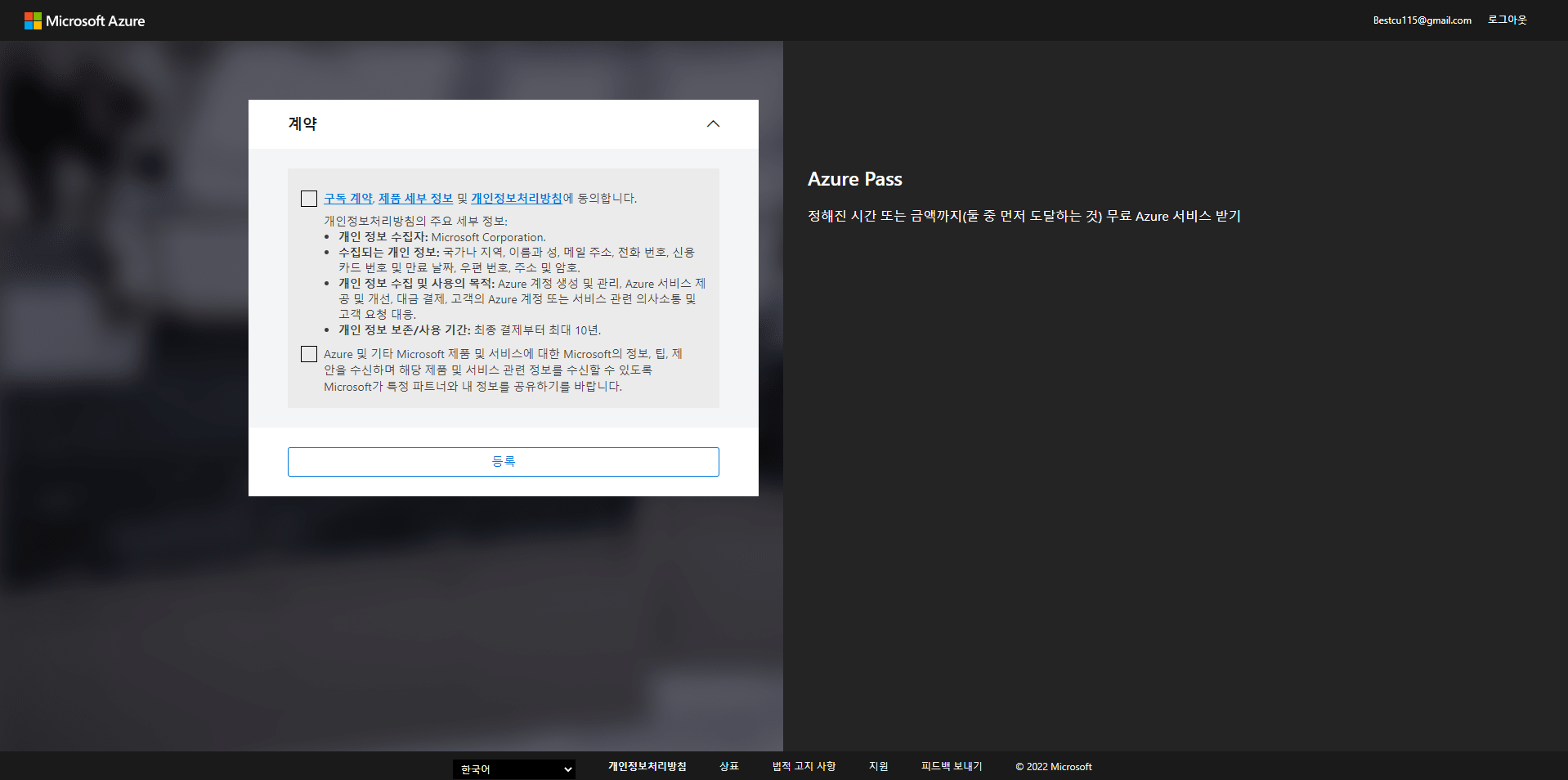 사실 해당 방법은 Microsoft에서 제공해주는 교육을 듣는 등의 다소 특별한 방법을 통해서 Azure Pass를 얻어야 사용할 수 있는 방법입니다. 저는 운이 좋게도 우연히 얻을 수 있는 계기가 있어서 생긴 Azure Pass를 사용해봤습니다. 추후에 Azure Pass를 얻을 수 있는 기회가 있으신 분들은 해당 게시물처럼 등록 후 사용하시면 될 것 같습니다. 등록절차는 아래의 절차에 따라 진행하시면 됩니다.