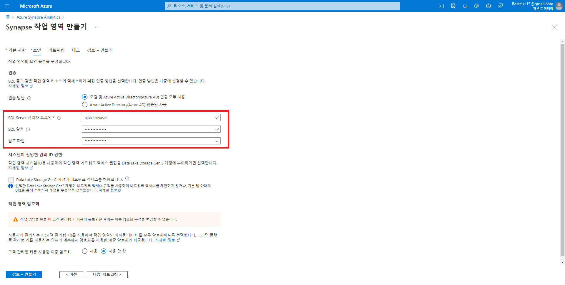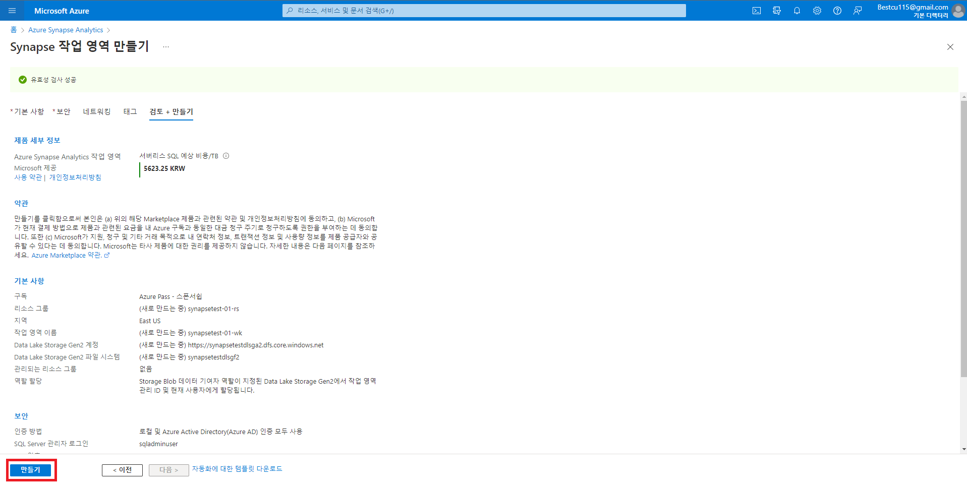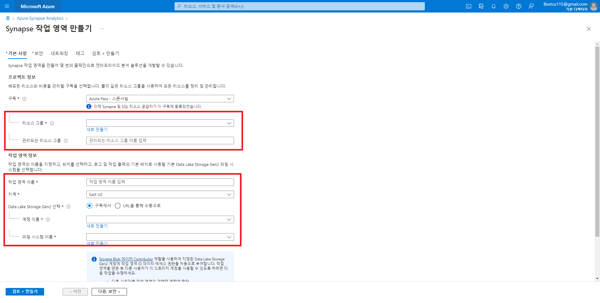 : ASA를 사용하여 데이터 분석을 진행하기 위해서는 우선 Synapse 작업영역을 만드는 과정이 필요합니다. Azure에서는 컨테이너, 스토리지, 분석툴, SQL서버 및 DB와 같은 리소스들을 리소스 그룹으로 묶어서 관리하기에 ASA의 사용을 위해서는 리소스 그룹을 생성하는 것이 필요합니다. 하지만 따로 생성을 하지 않아도 Synapse작업영역을 만들면서 생성이 가능하므로 이번에는 바로 Synapse 작업영역을 생성하며 필요한 리소스 그룹 및 리소스들을 같이 생성해주었습니다. 생성하는 리소스 및 리소스 그룹과 관련된 사항들은 반드시 메모장과 같은 다른 파일에 저장하여 주시는게 좋습니다.