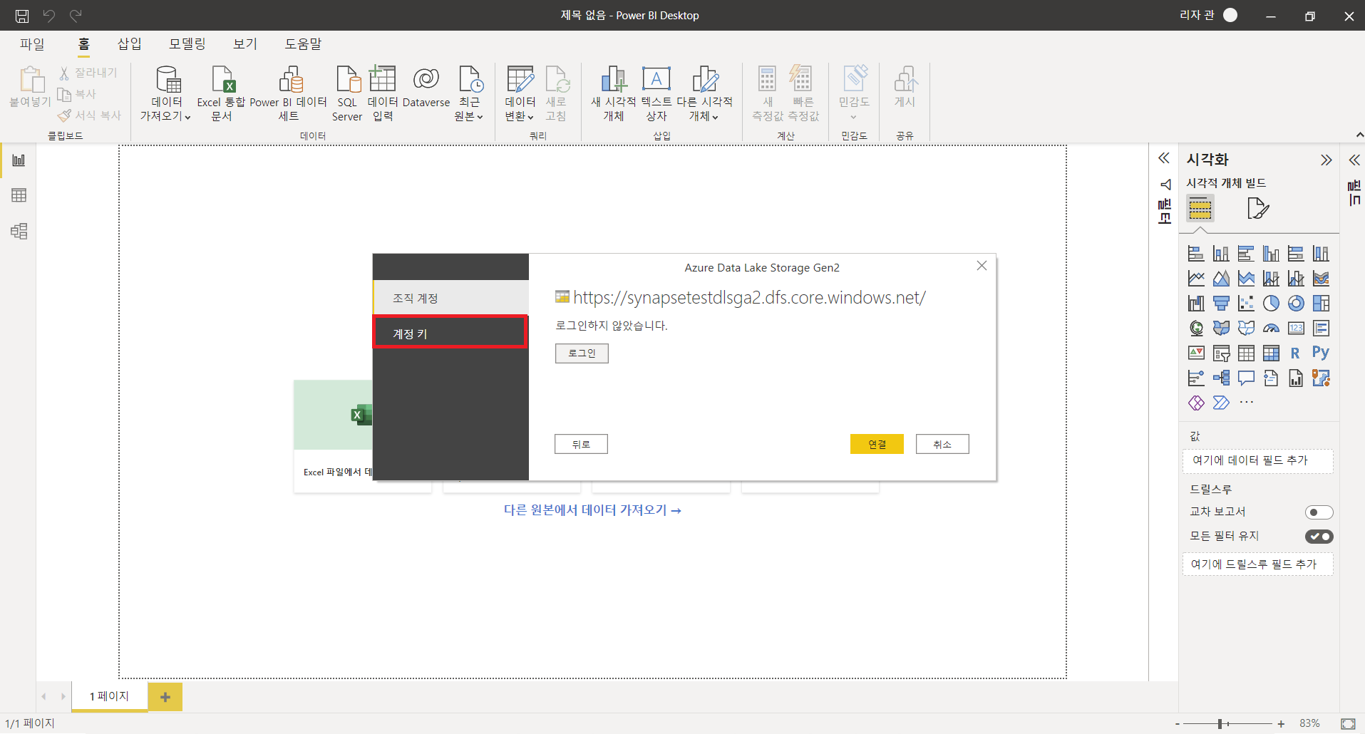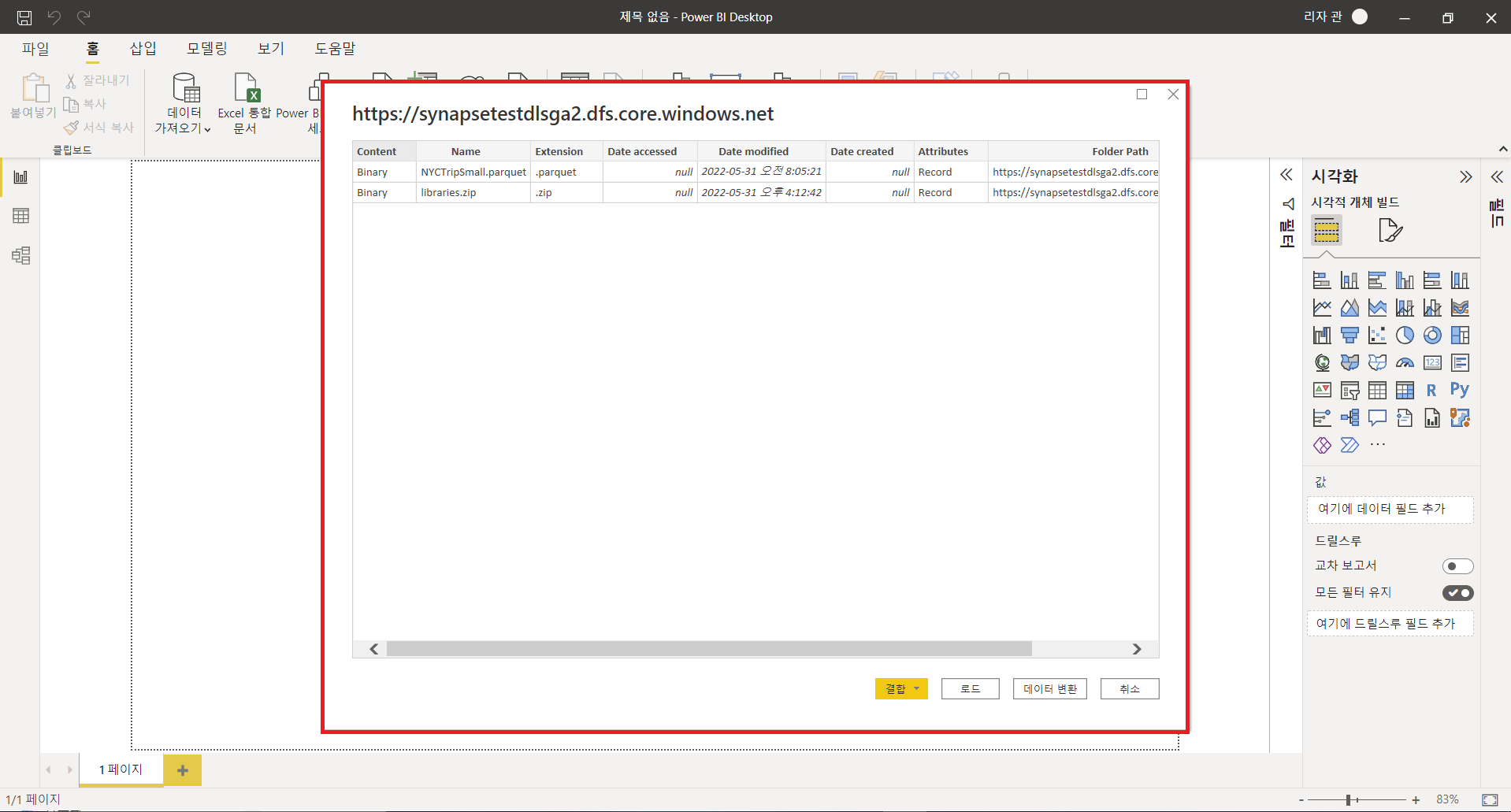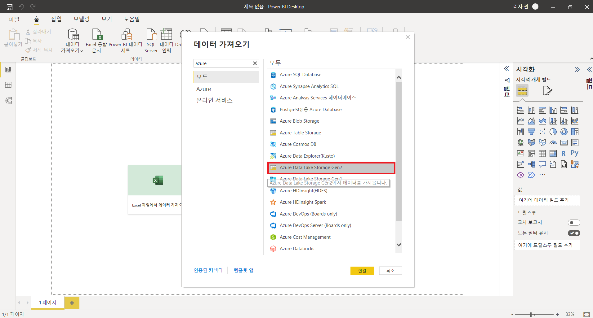 : 파이프라인을 통해 데이터를 가공 및 저장하는 과정을 완료하였다면, 시각화 도구인 Power BI와 Data Lake를 연결하여 데이터를 시각화할 수 있습니다. Power BI와 직접 연결 또는 Azure Analysis Services와 연동 후 Power BI와 Analysis Services와 연결하여 분석을 진행할 수 있습니다. 여기서는 Power BI와 직접 연결하였으며, 세부내용은 아래 사진들을 참조하시면 되겠습니다.
