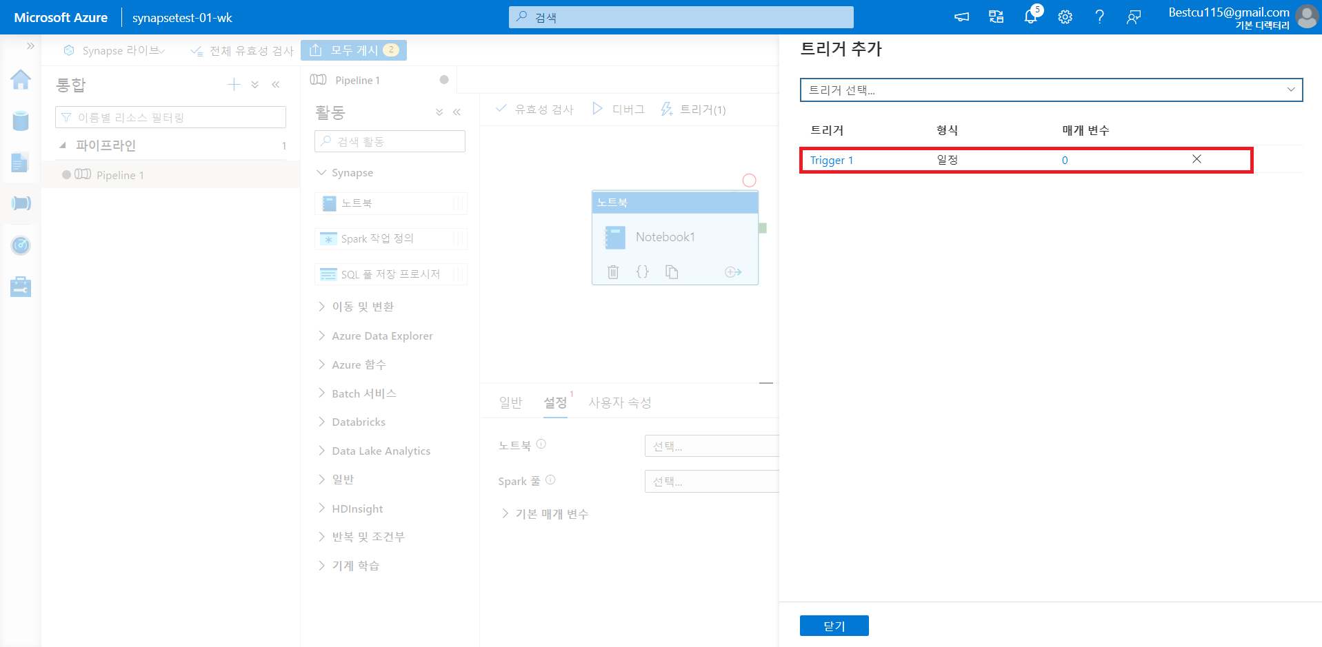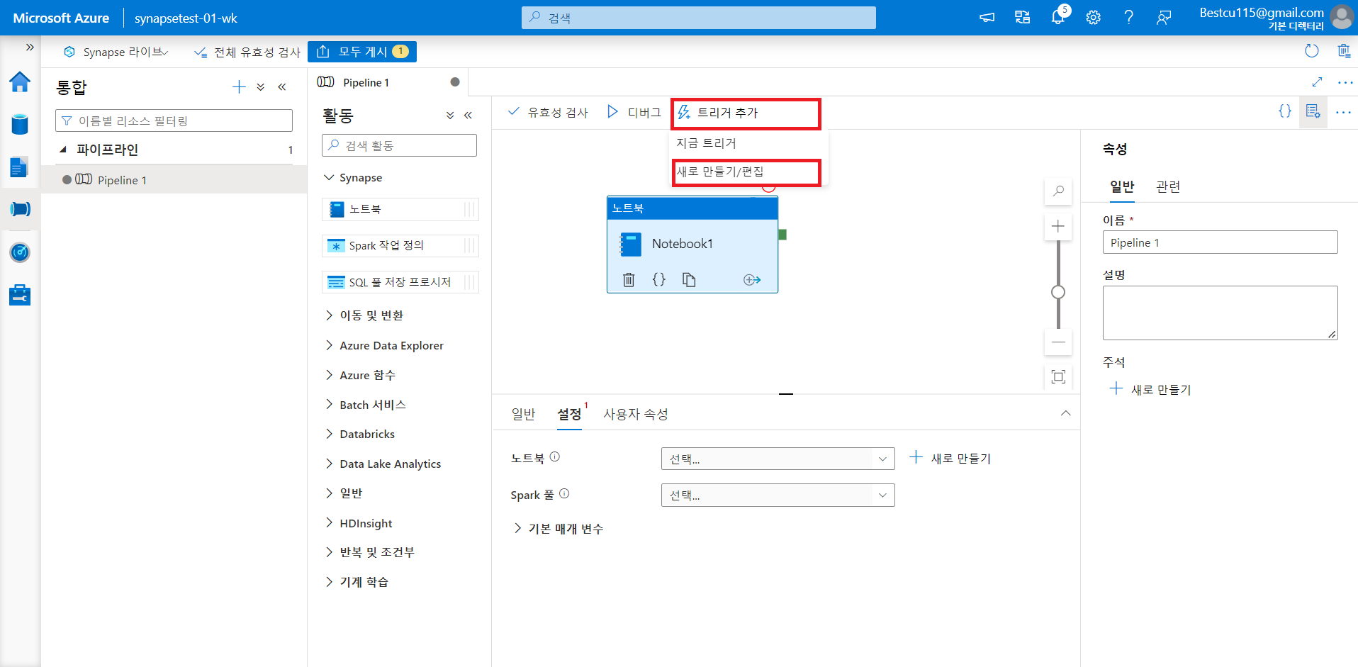 : Synapse 작업영역에서 분석에 사용할 수 있게 데이터를 저장 및 변형해주었다면, 해당 내용들을 통합하여 일련의 과정으로 만들고 이를 정기적으로 업데이트하기위해서는 파이프라인 구축이 필요합니다. 파이프라인 생성과 트리거 지정을 통해 사용자는 데이터를 업로드만 하면 자동으로 원하는 형태로 가공된 데이터 얻을 수 있습니다. 여기서는 간단한 파이프라인 생성법과 트리거 작성법에 대해서만 진행했으며, 세부 내용은 아래 사진들과 같습니다.