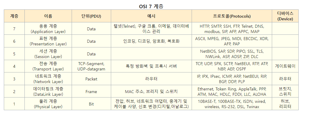 : 네트워크 프로토콜이 통신하는 구조를 7개의 계층으로 분리하여 각 계층이 상호작용하는 방식을 정의해 놓은 것으로, ISO(International Organization Standardization)가 1984년에 발표하였습니다. 통신이 일어나는 과정을 7단계로 구분하여 한눈에 볼 수 있게 정의한 것이 특징이며, 컴퓨터 통신 구조모델과 앞으로 개발될 프로토콜의 표준 제공을 위해 개발된 모델이기에 네트워크의 구성을 예측하고 이해하는 것이 가능합니다. 네트워크에서 트래픽의 흐름을 볼 수 있고, 각 계층은 독립되어 있기에 특정 단계에서 오류 발생시 다른 단계의 장비 및 소프트웨어를 건드리지 않고 오류 수정이 가능합니다.