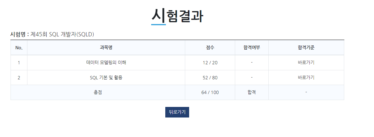 SQLD는 2번을 응시해서 간신히 합격한 시험으로, 주변에서는 조금만 공부해도 합격하는 쉬운 자격증이라던데 개인적으로는 꽤나 어려웠던 시험이었다. 어차피 DB와 SQL에 대한 공부를 지속적으로 해서 SQLP까지도 취득을 하려고 생각중이어서 합격만 하면 되는 것이긴 했지만 그래도 좀 더 높은 점수을 받게끔 열심히 했어야 했다는 생각이 드는 건 어쩔 수 없는 것 같다. 지금의 이 생각을 가지고 앞으로 더 해당 분야에 대한 공부를 이어나가야겠다고 생각한다.