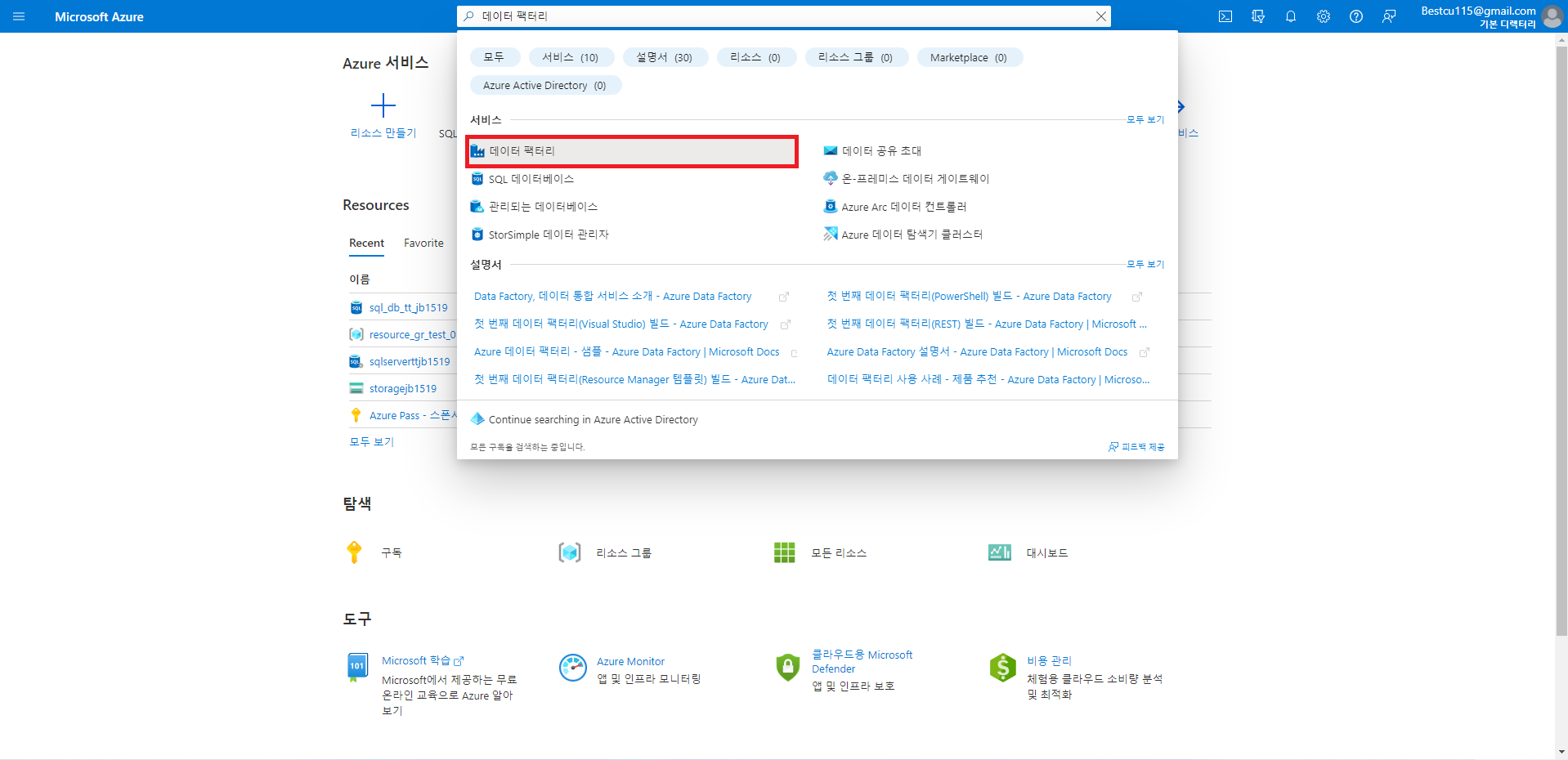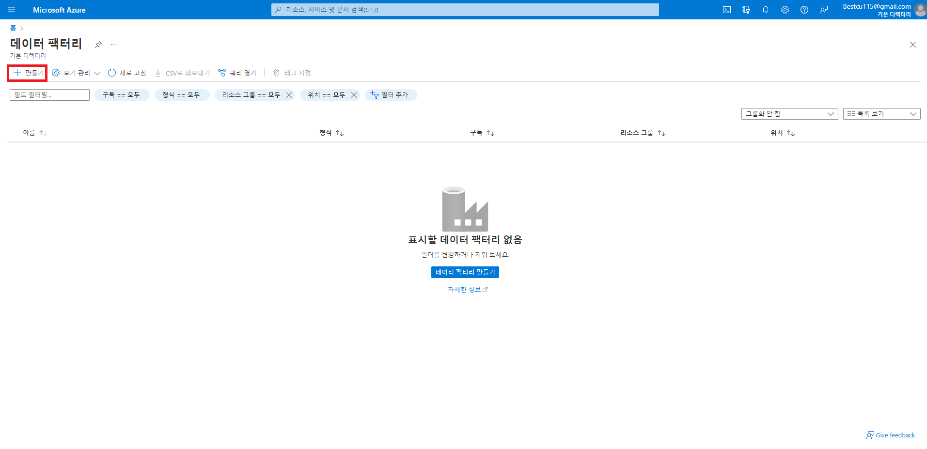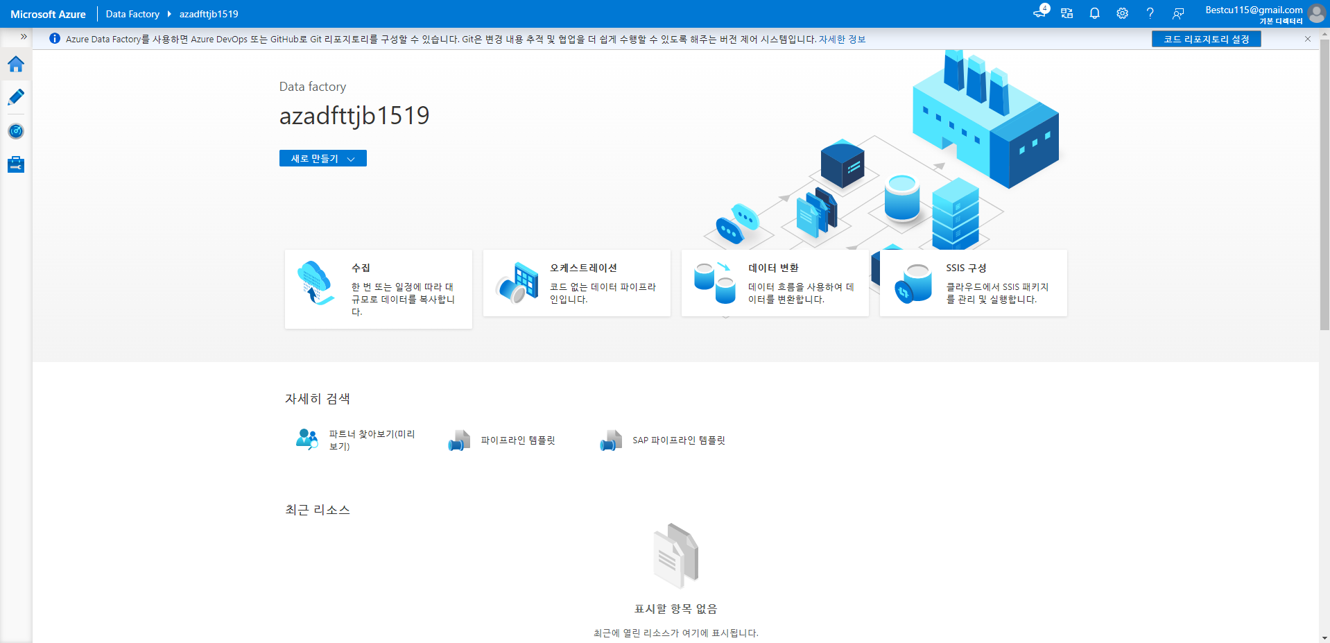 : SQL Server에 시각화할 형태로 데이터들이 모두 가공되어 있으면 따로 ADF서비스가 필요가 없을 수도 있지만 매번 사람의 손으로 데이터를 가공하고 실행시킨다면 그에 소모되는 노동력과 시간과 같은 비용이 클 겁니다. 이와 같은 ETL과정을 자동화할 수 있는 서비스를 제공하는 것이 ADF이며, ADF를 사용하기 위해서는 당연하게도 ADF를 생성하는 과정이 필요합니다. 생성절차와 과정은 어렵지 않으며 아래의 사진을 따라 하시면 충분히 활용하실 수 있으실 겁니다.