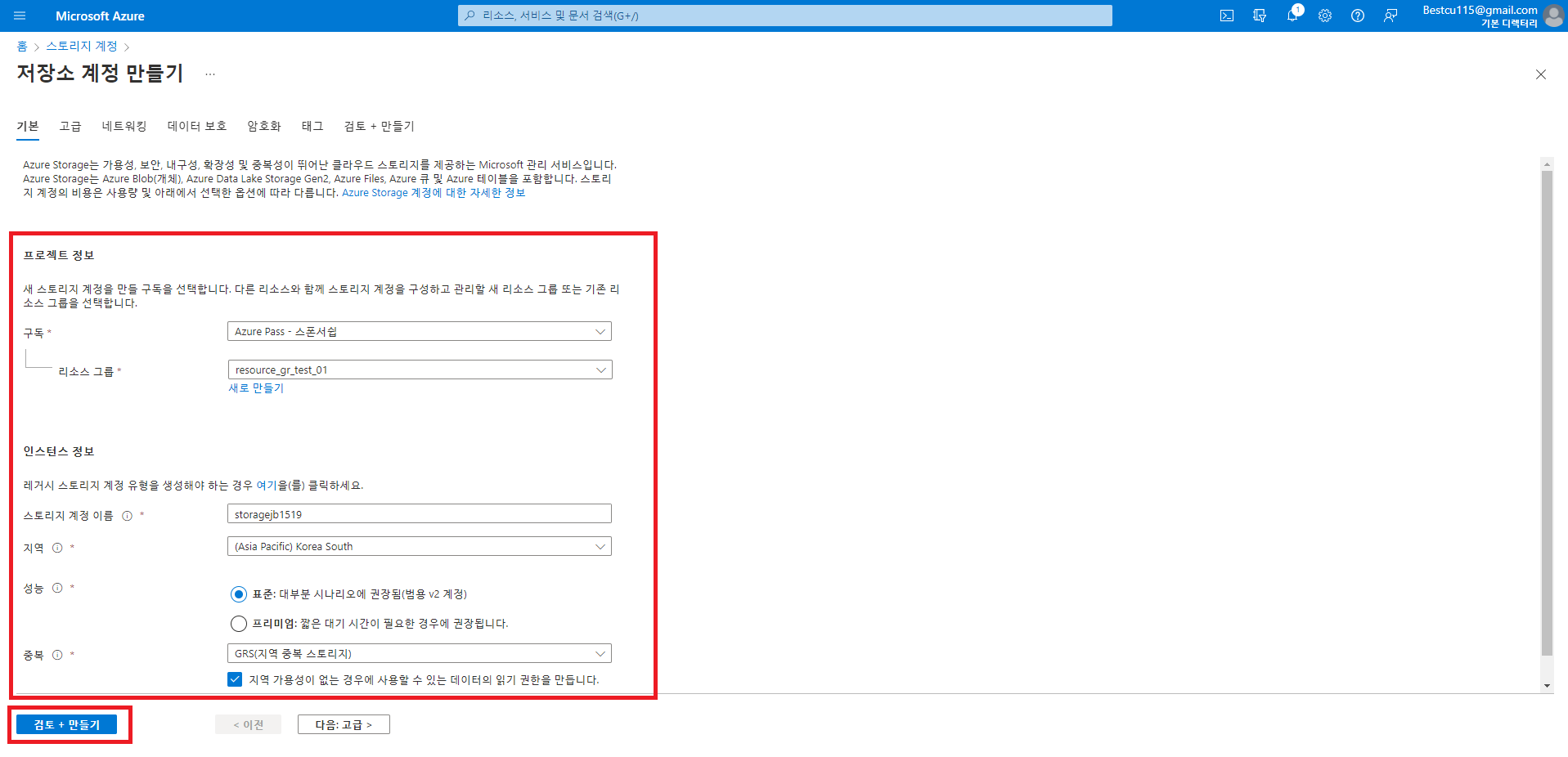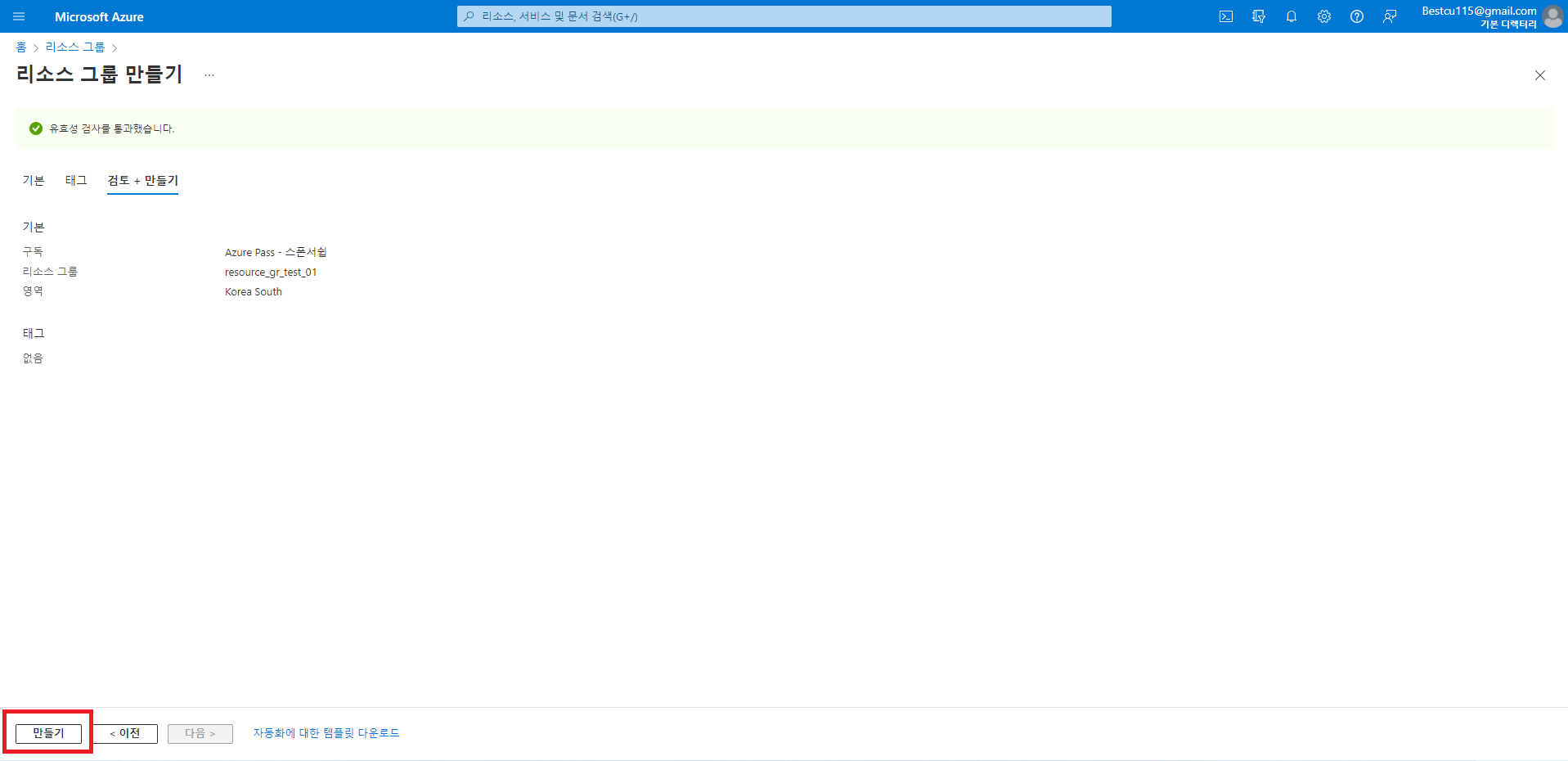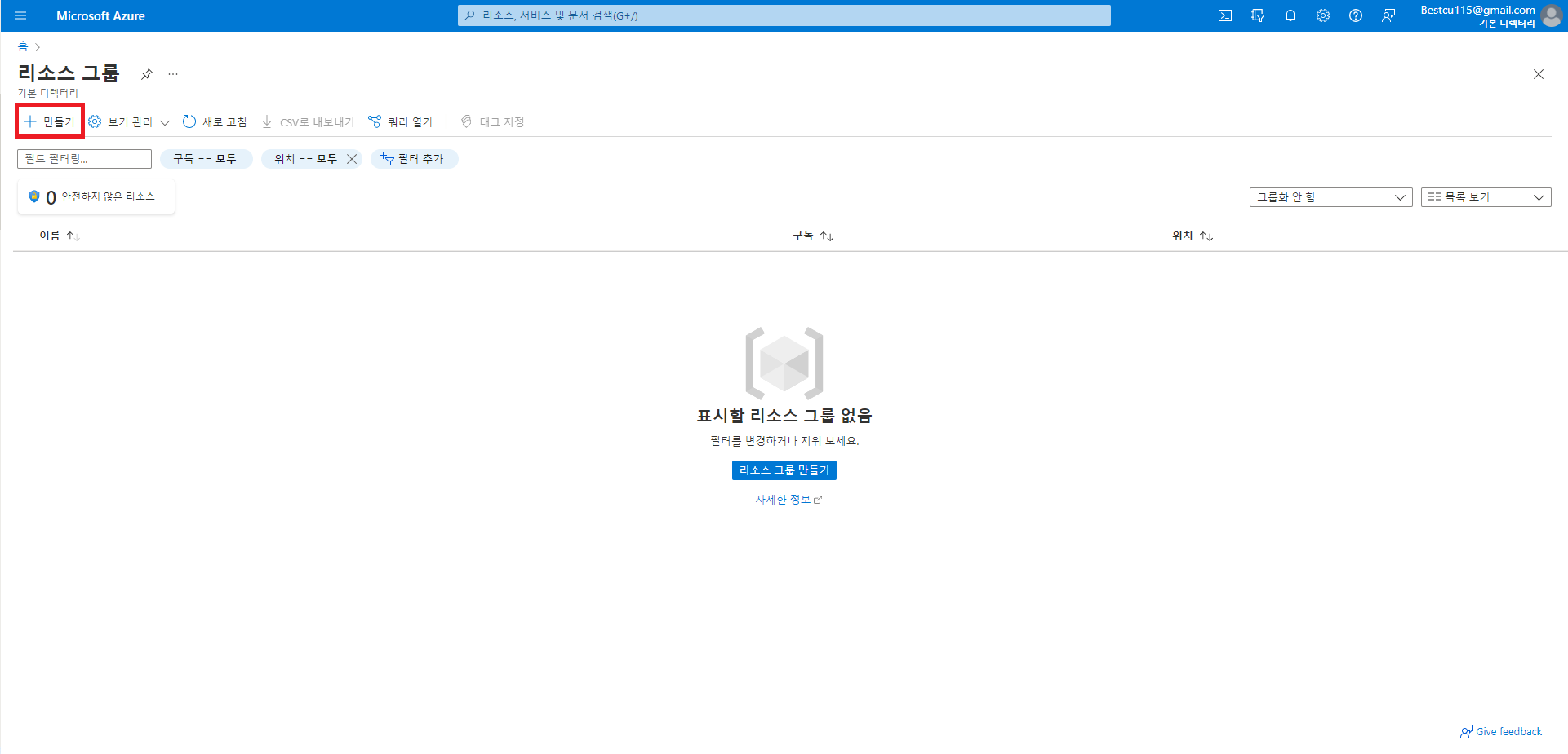 : Azure에서 제공하는 서비스들을 이용하고 관리하기 위해서는 최우선적으로 리소스 그룹을 만들어야 하며 추후에도 생성한 서비스들을 이 리소스 그룹 중 하나에 묶어서 관리를 하게 됩니다. 즉, 리소스 그룹을 만드는 것이 가장 먼저 이루어지는 과정이며, 생성시 작성하는 계정이름 및 각종 정보들은 반드시 메모장이나 다른 곳에 내용을 작성 후 보관해주시는 게 좋습니다.