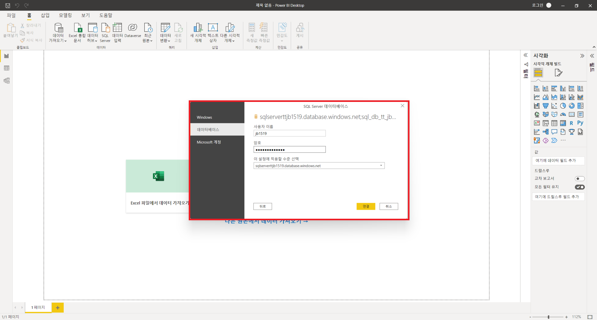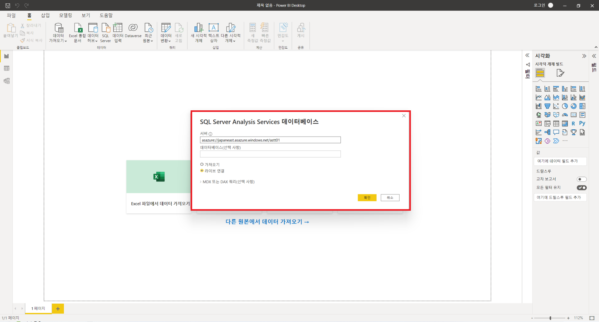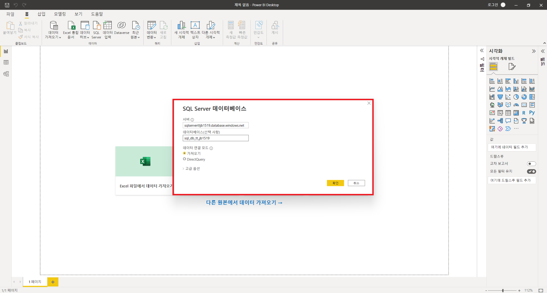 : 위와 같이 데이터를 변형하는 과정을 구성하였다면 PowerBI와 SQL DB를 직접연결하여 데이터를 시각화하거나 Analysis Service를 생성하여 PowerBI와 연결하여 시각화할 수 있습니다. 데이터가 많고 분석해야할 내용이 많다면 PowerBI의 자체기능만으로 작성하게 되면 속도와 성능문제가 존재하기에 분석을 따로 해준 후 결과값만을 로드해서 사용해서 쓸 수 있게 해주는 서비스를 Analysis Service라고 생각하시면 됩니다. Analysis Service 사용을 위해서는 Visual Studio의 사용이 필수적이며, 환경설정도 그에따라 맞추는 과정이 필요합니다. 이번 게시글에서 사용한 환경설정이 궁금하신 분들은 위의 게시물을 참조하시기 바랍니다. SQL DB와 직접 연결하는 방법은 매우 간단하며, 자세한 방법은 아래와 같습니다.