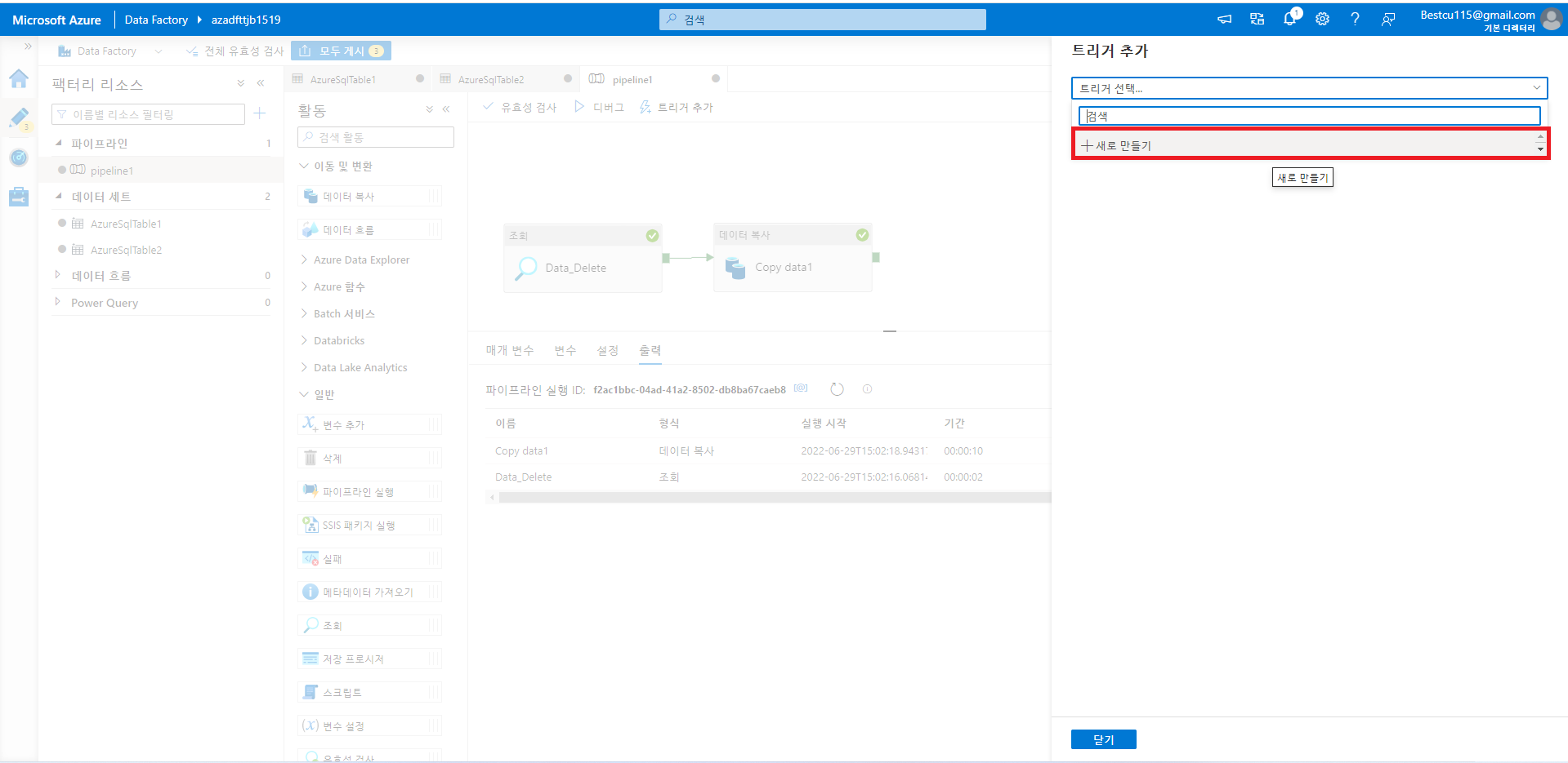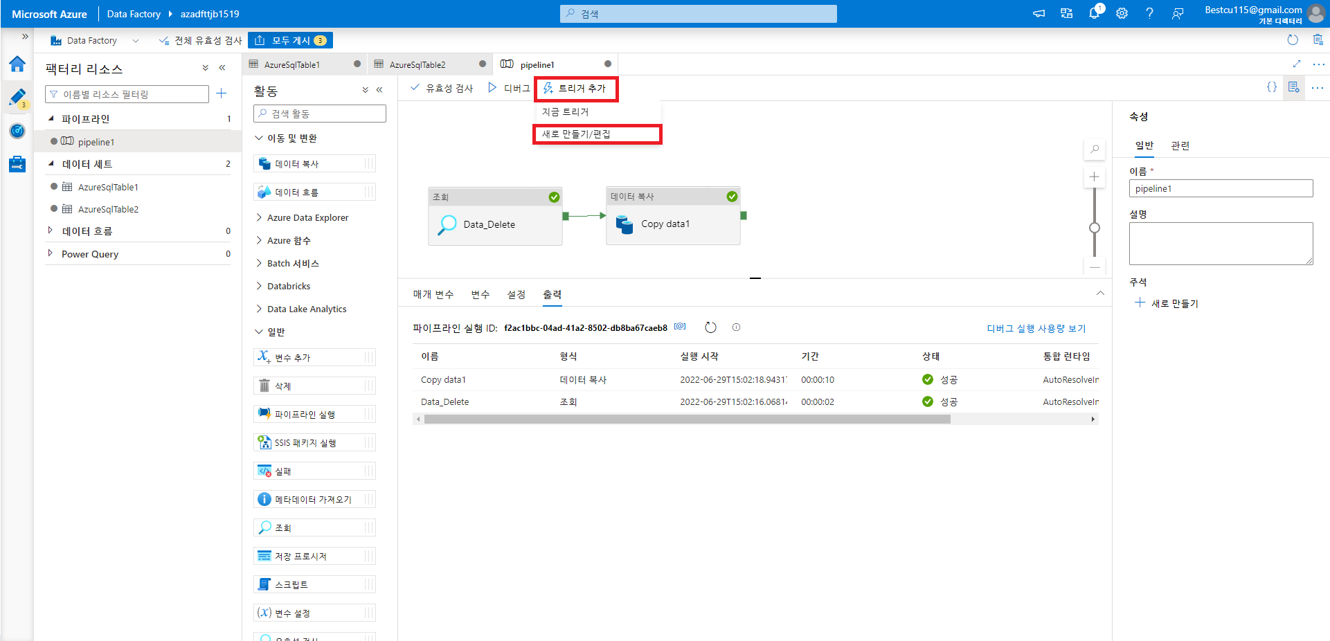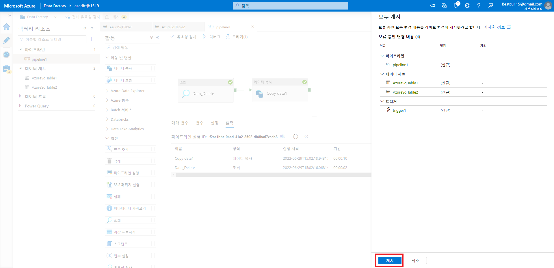 트리거를 사용하고 및 변경사항을 ADF에 적용하기 위해서는 게시를 해주는 과정이 반드시 필요합니다.