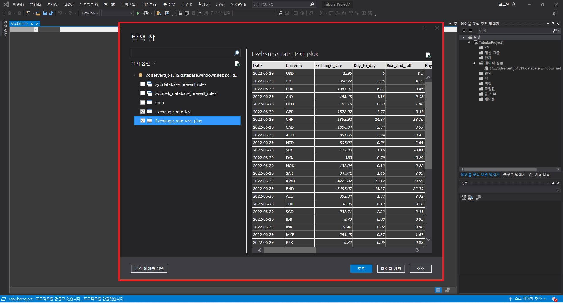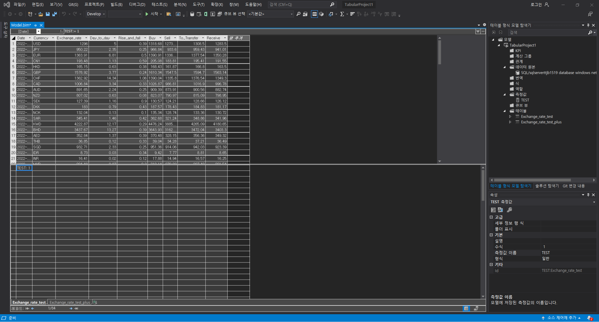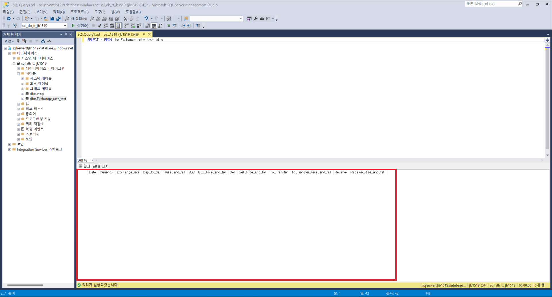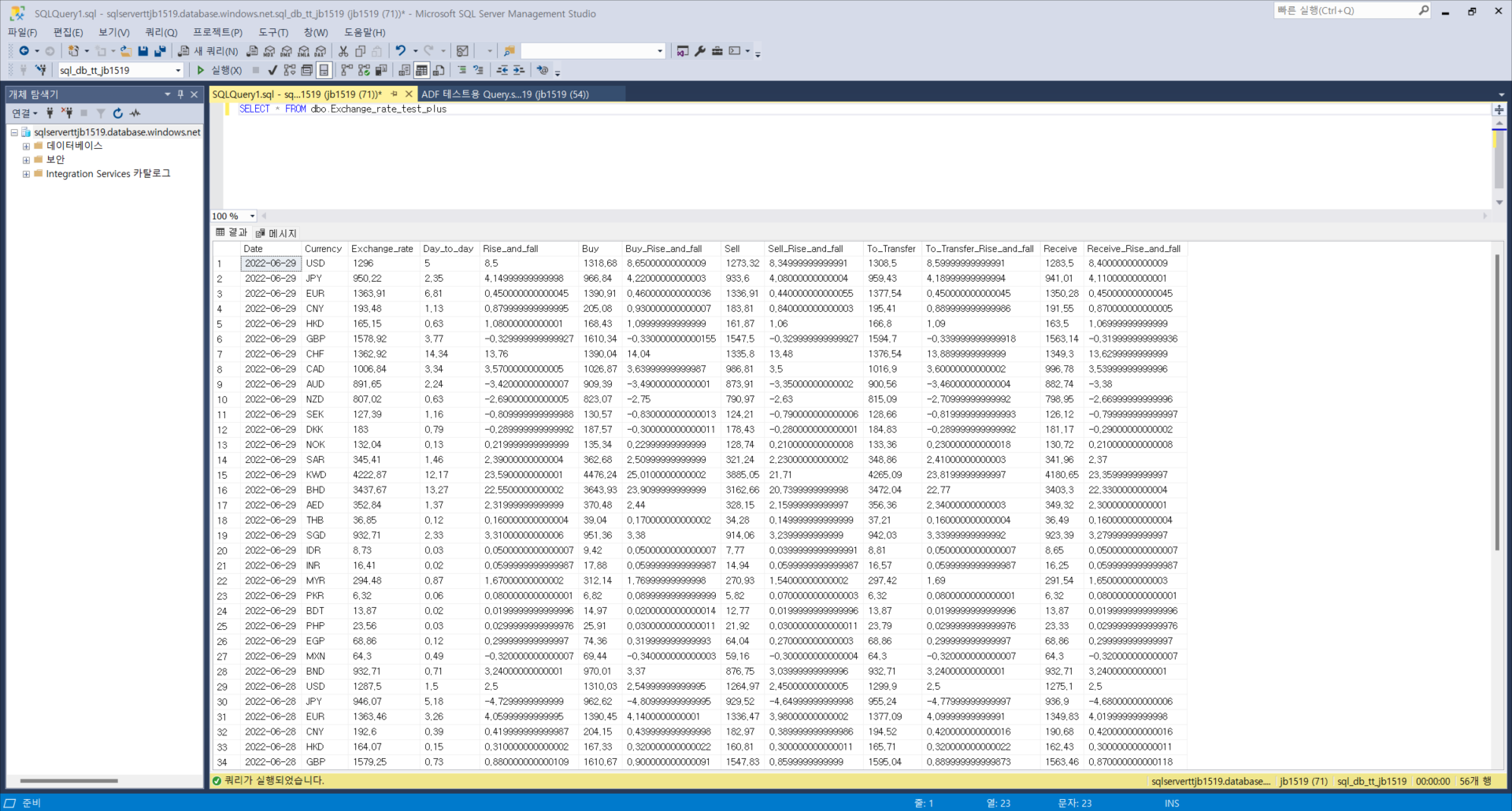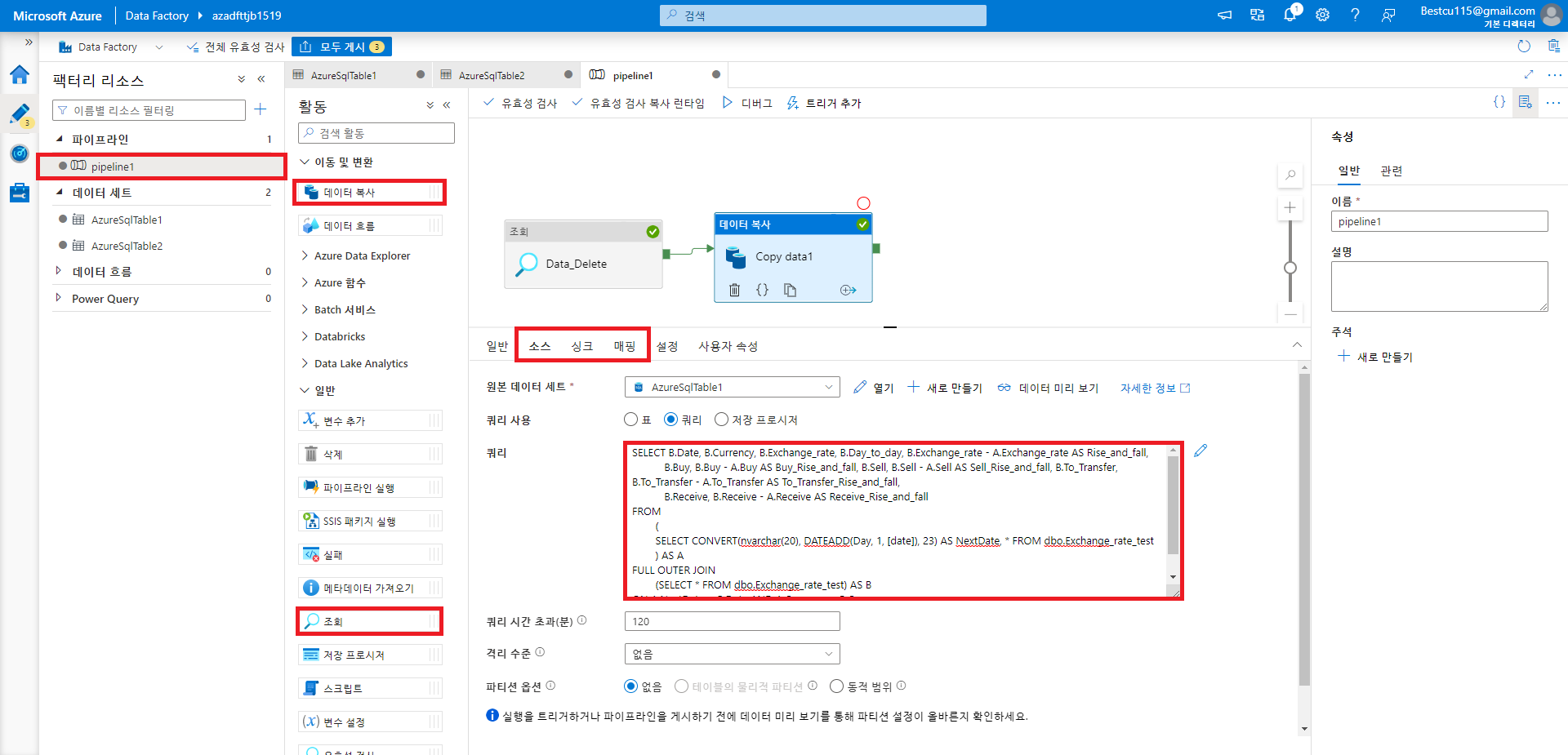 Data Delete부분은 새로 작성한 테이블인 dbo.Exchange_rate_test_plus의 데이터를 모두 삭제하는 부분이며, Copy data1은 dbo.Exchange_rate_test의 데이터를 변형하여 dbo.Exchange_rate_test_plus테이블에 삽입하는 부분입니다. 소스에 쿼리문을 쓰면 사실 원본 데이터세트는dbo.Exchange_rate_test가 아니어도 상관은 없으나 직관성 향상을 위해 dbo.Exchange_rate_test로 원본 데이터 세트를 지정해주었습니다. 싱크에는 해당 쿼리문 또는 원본 데이터세트를 복사할 dbo.Exchange_rate_test_plus를 원본 데이터 세트로 지정하였고, 매핑 메뉴에서 스키마의 일치여부를 확인 및 수정가능합니다.