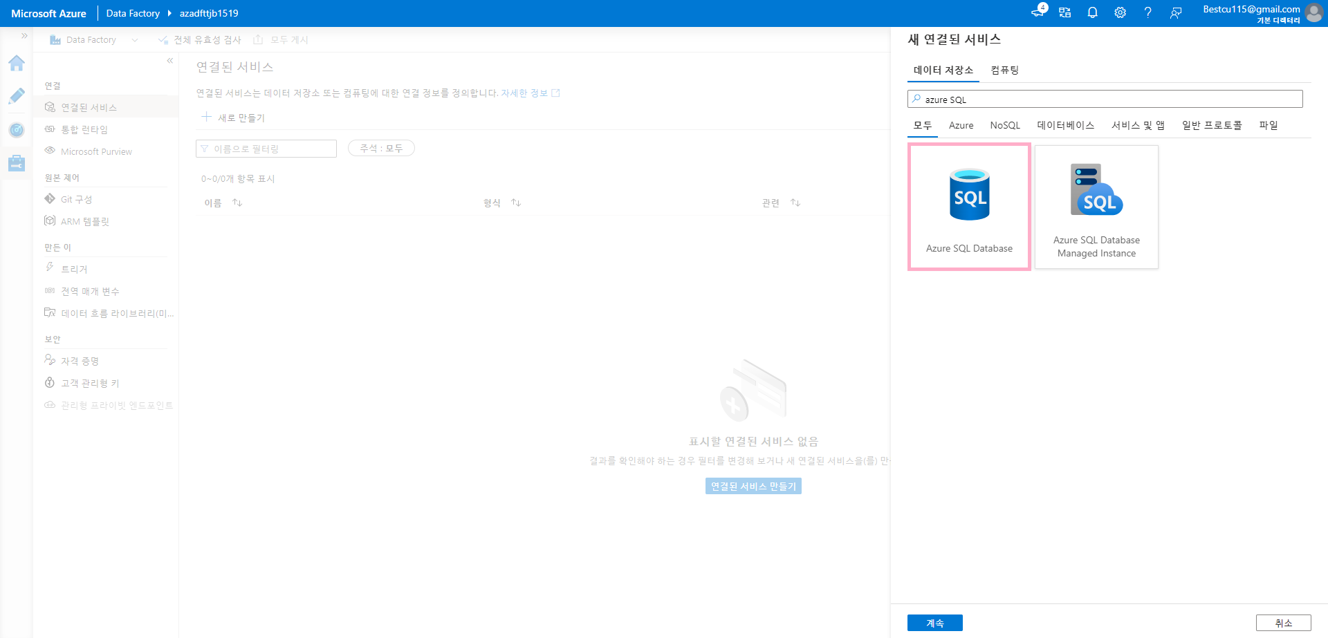 : ADF에서 DB를 사용하기 위해서는 등록을 해주는 과정이 필요합니다. 이를 위해 SSIS(SQL Server Integration Services), 통합런타임(Integration Runtime)을 사용하기도 하지만 같은 Azure 서비스라면 이와 같은 프로그램들의 추가 설치 없이 연결하는 것이 가능합니다. DB를 등록하는 과정은 아래와 같습니다.