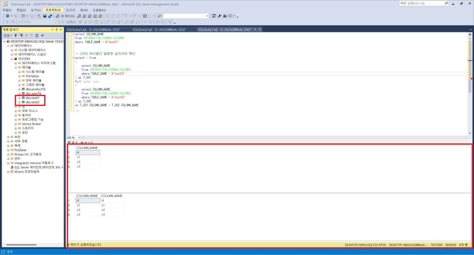 : 특정 테이블의 컬럼 이름이 무엇인지 알아야 할 때도 있고 2개의 테이블의 컬럼 이름의 일치여부를 확인해야할 상황이 있을 수도 있습니다. 이럴 때는 INFORMATION_SCHEMA.COLUMNS과 JOIN기능을 통해 손쉽게 해결할 수 있으며, 자세한 쿼리문과 내용은 사진을 참고해주시기 바랍니다.