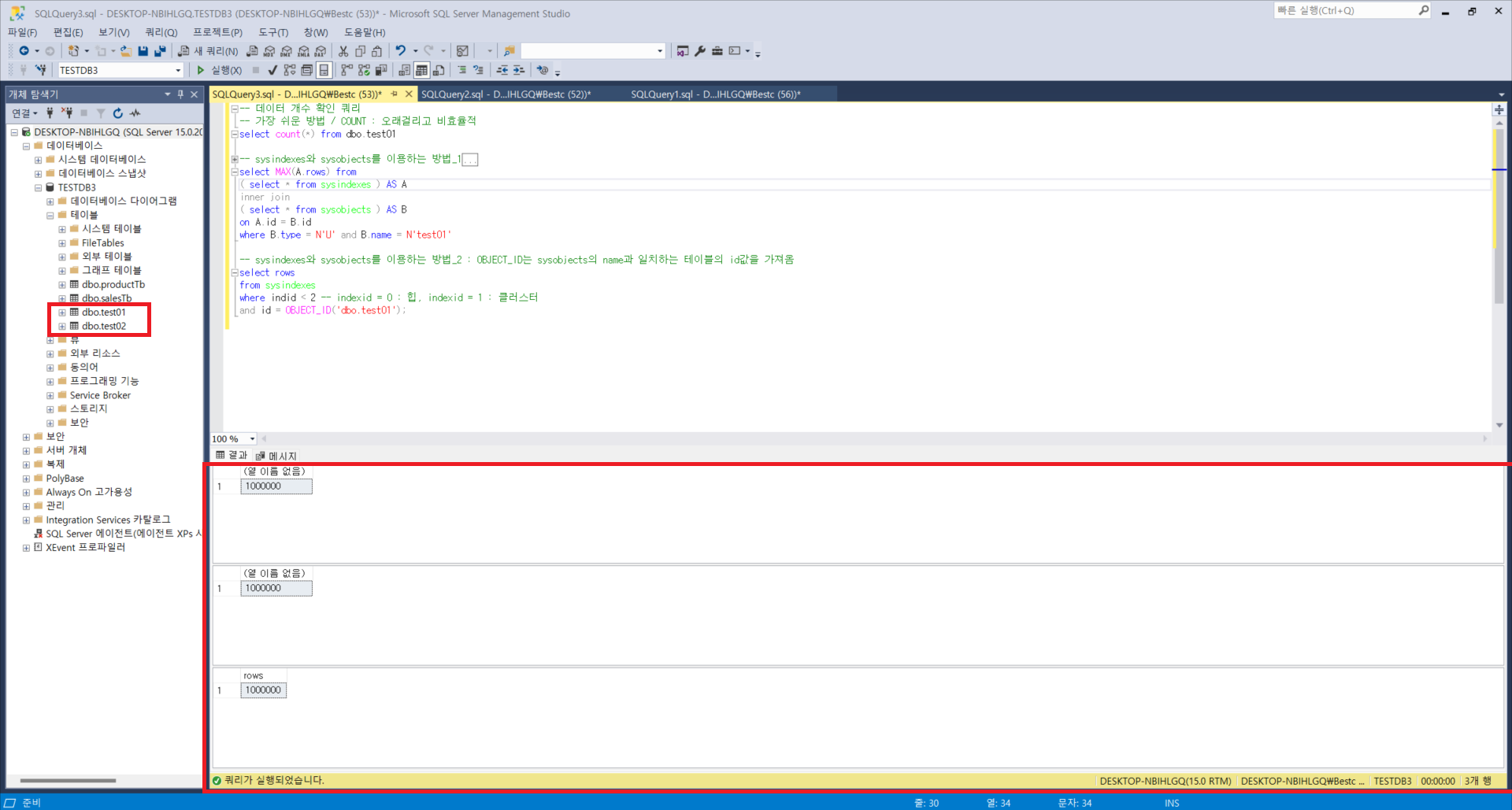 : 테이블의 전체 행수를 구하는 가장 간단한 방법은 count 함수를 사용하는 것입니다. 하지만 억단위 데이터로 넘어가면 시간이 굉장히 오래걸리기 때문에 좋은 쿼리문은 아니라고 할 수 있습니다. 이때 사용할 수 있는 것이 sysindexes와 sysobjects이며, 자세한 쿼리문들과 내용은 사진을 참고해주시기 바랍니다.