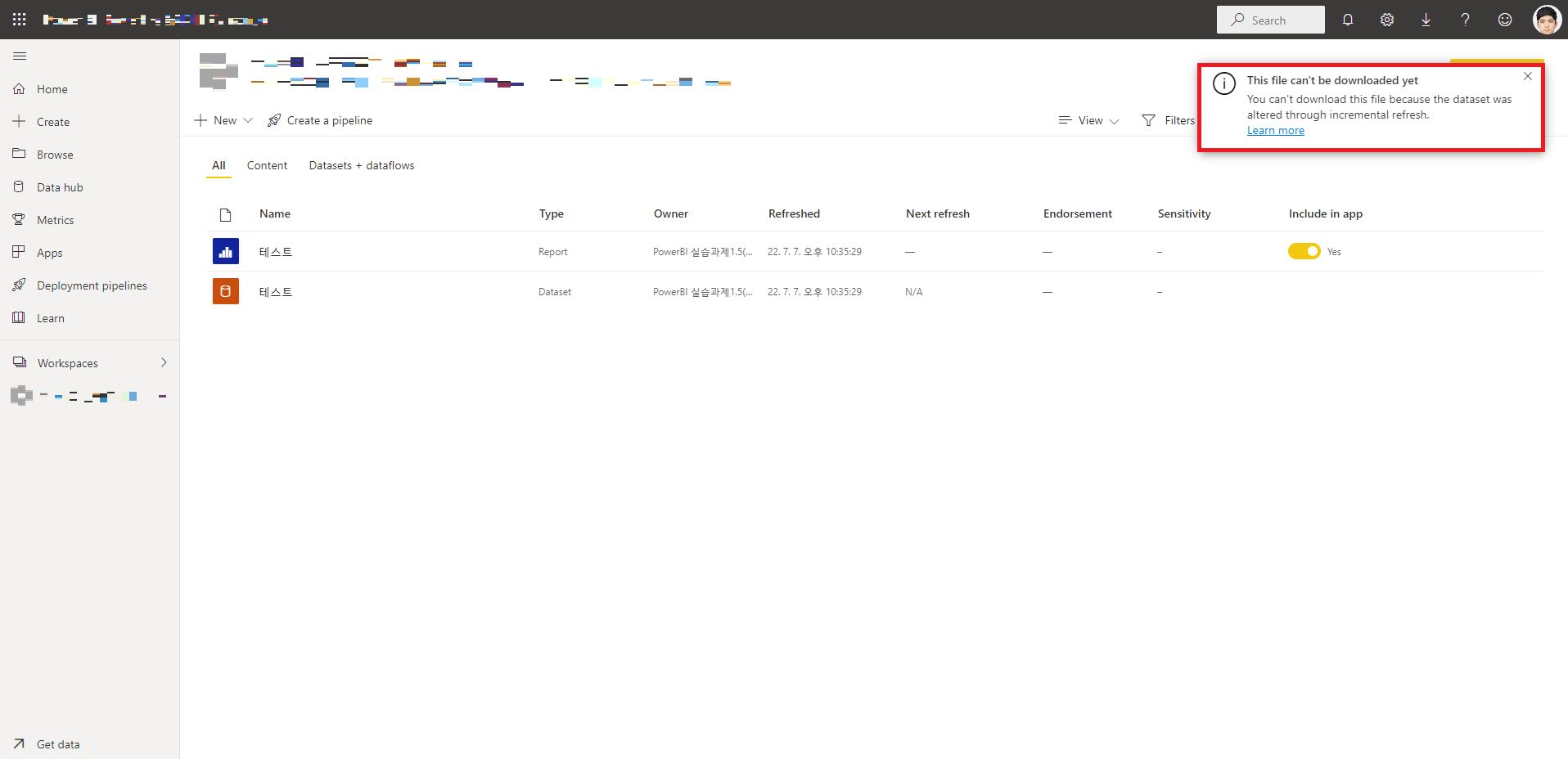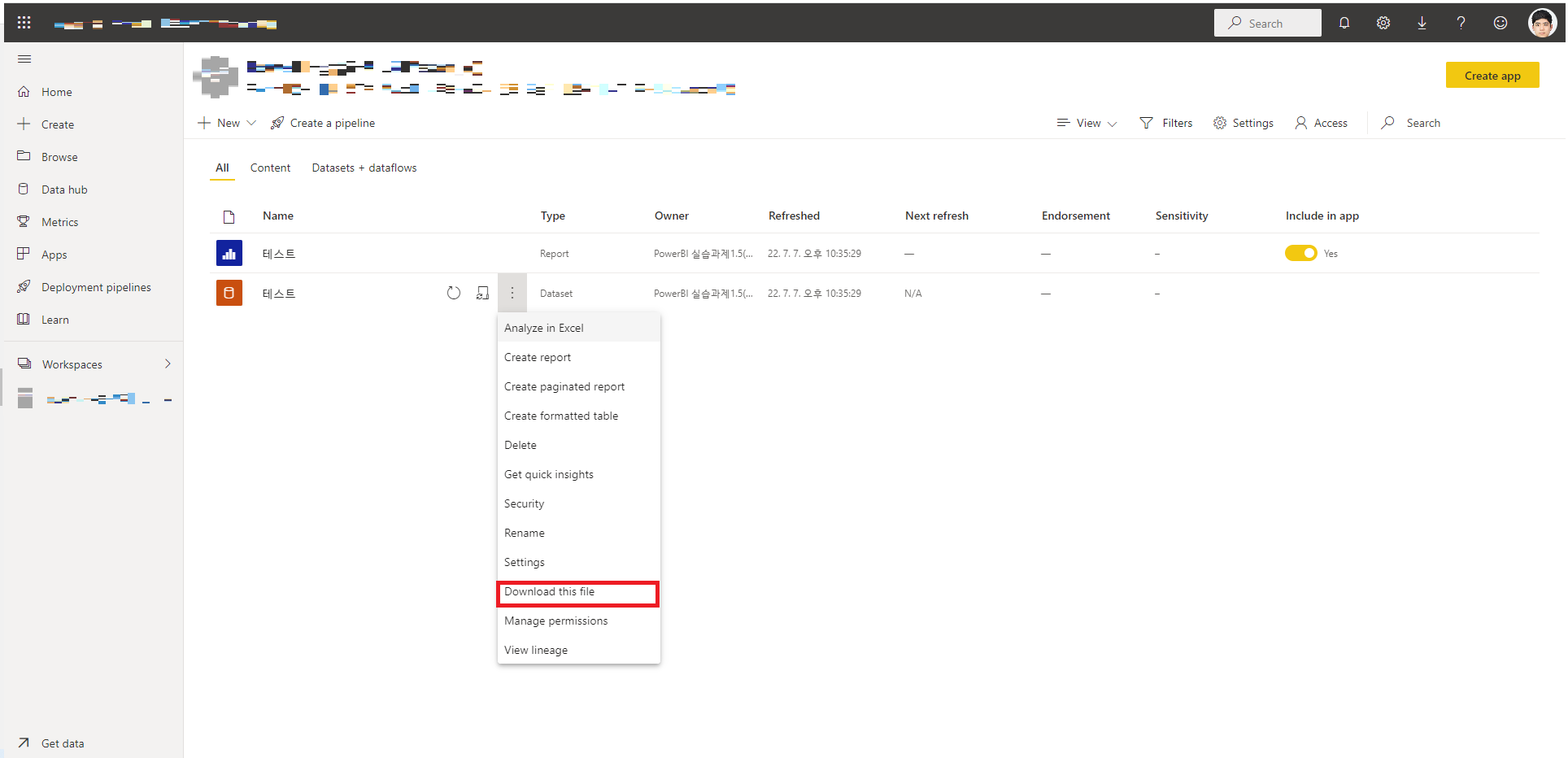 위의 조건들을 만족했다면 다운로드가 불가능한 Power BI 파일을 복구하는 것이 가능하며, 아래의 순서를 따라서