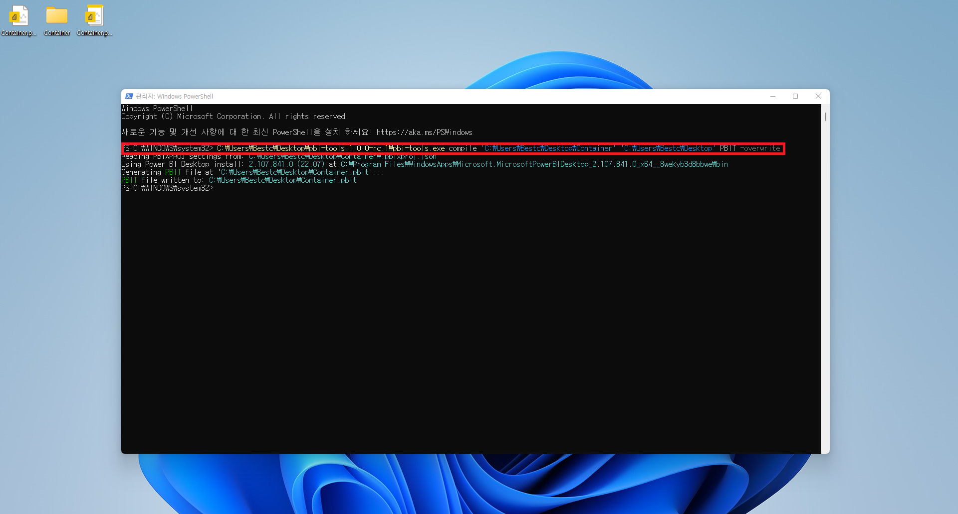 C:\Users\Bestc\Desktop\pbi-tools.1.0.0-rc.1\pbi-tools.exe compile 'C:\Users\Bestc\Desktop\Container' 'C:\Users\Bestc\Desktop' PBIT -overwrite