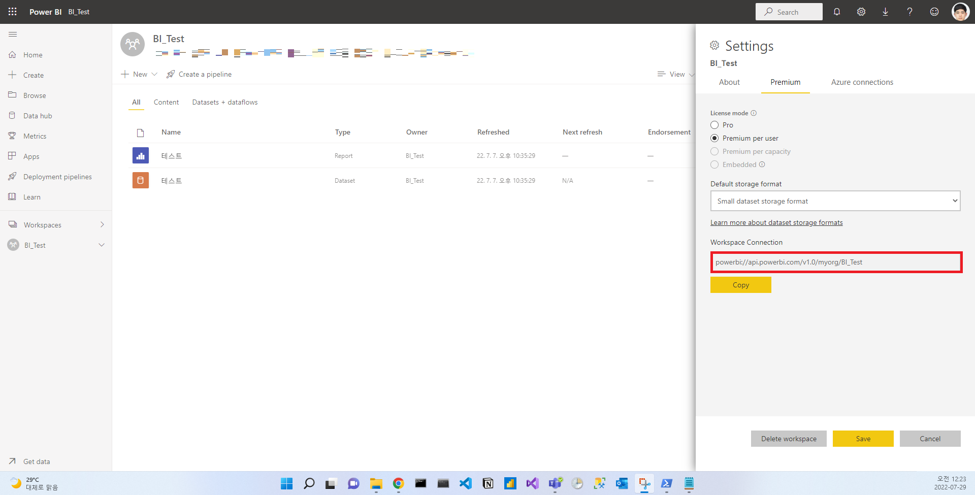 - Power BI Portal에서 XMLA-Endpoint와 연결할 주소를 확인합니다.(Premium 계정이 필요)