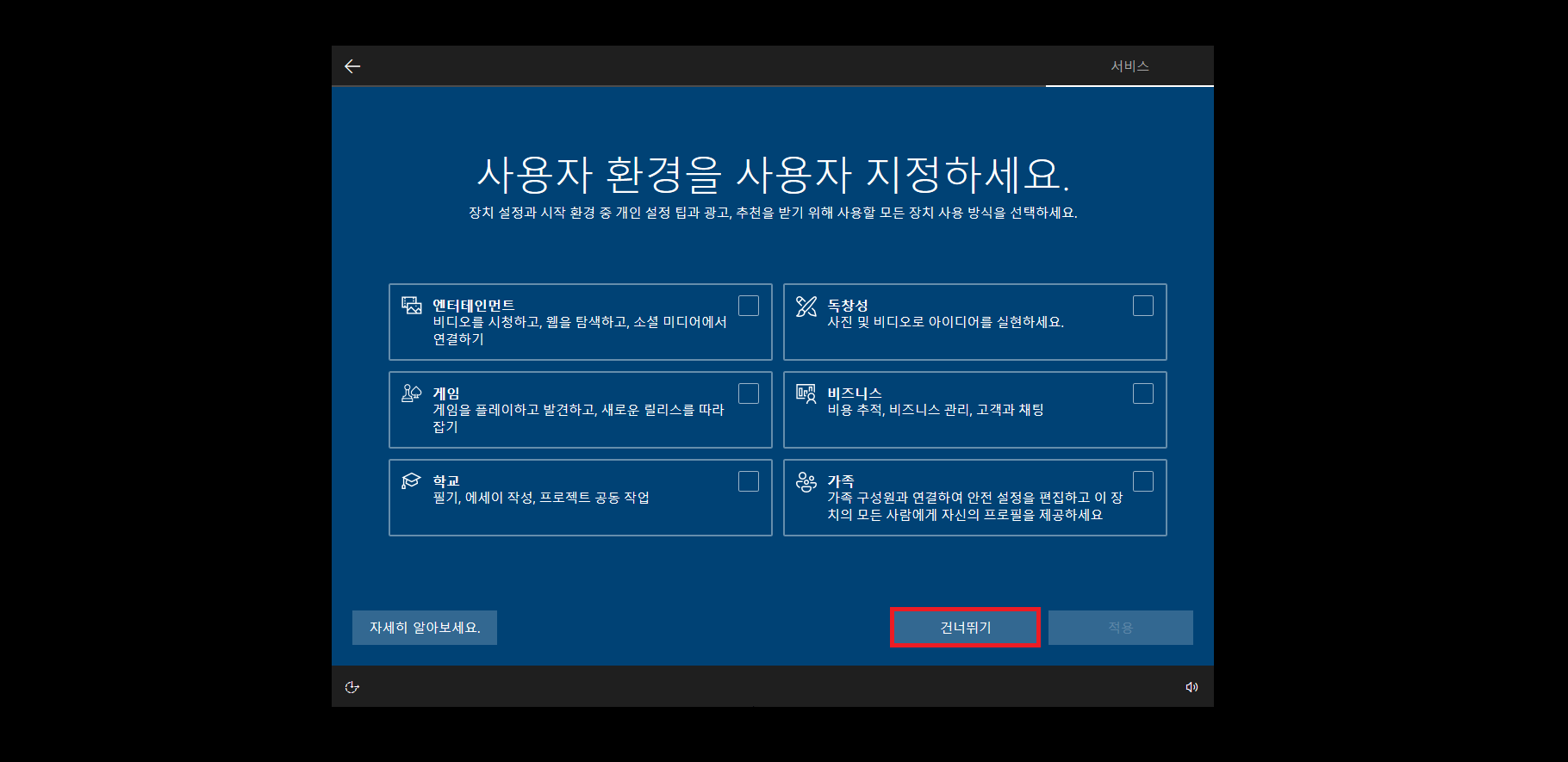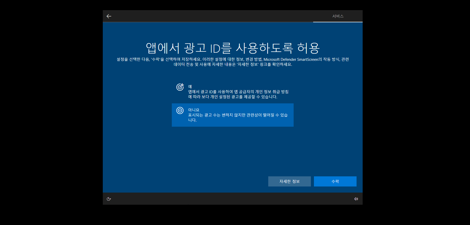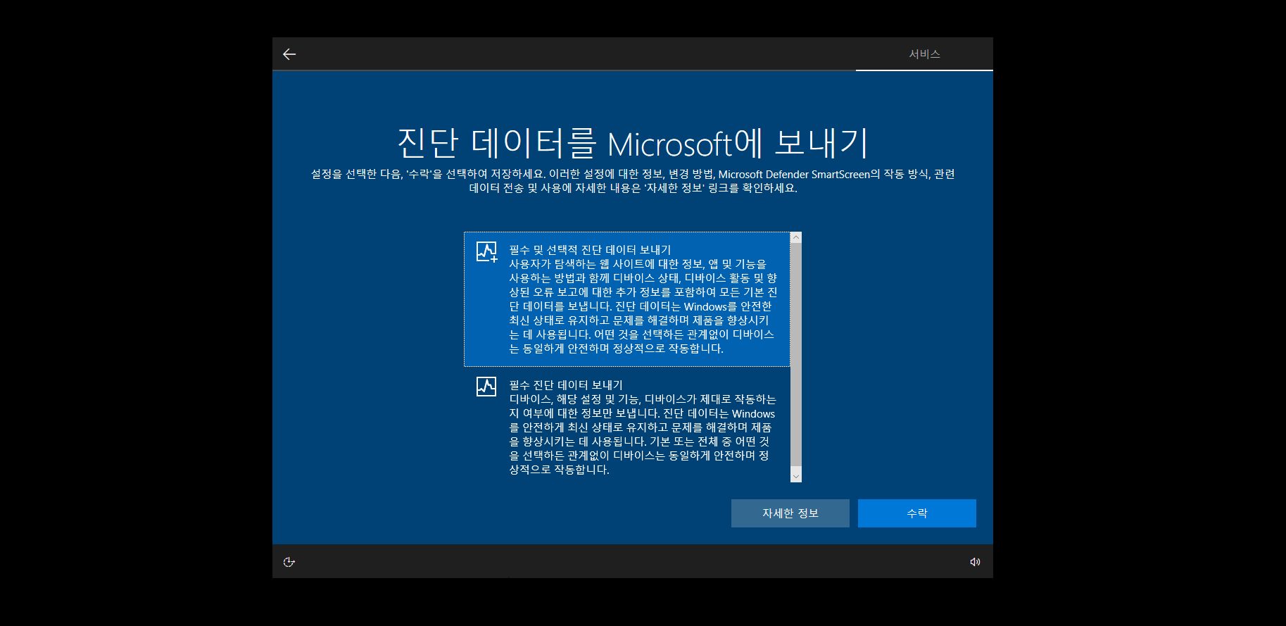 - 사용자 위치, 내 장치 찾기, 진단데이터 보내기 등 각종 Windows 설정을 진행하고 설치 완료합니다.