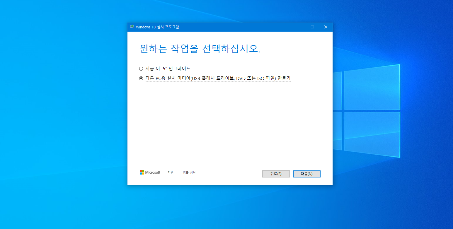 - 다운로드한 파일을 실행하여 사용권 계약서를 동의하고 다른 PC용 설치 미디어 메뉴를 선택 후 ISO 파일을 생성합니다.