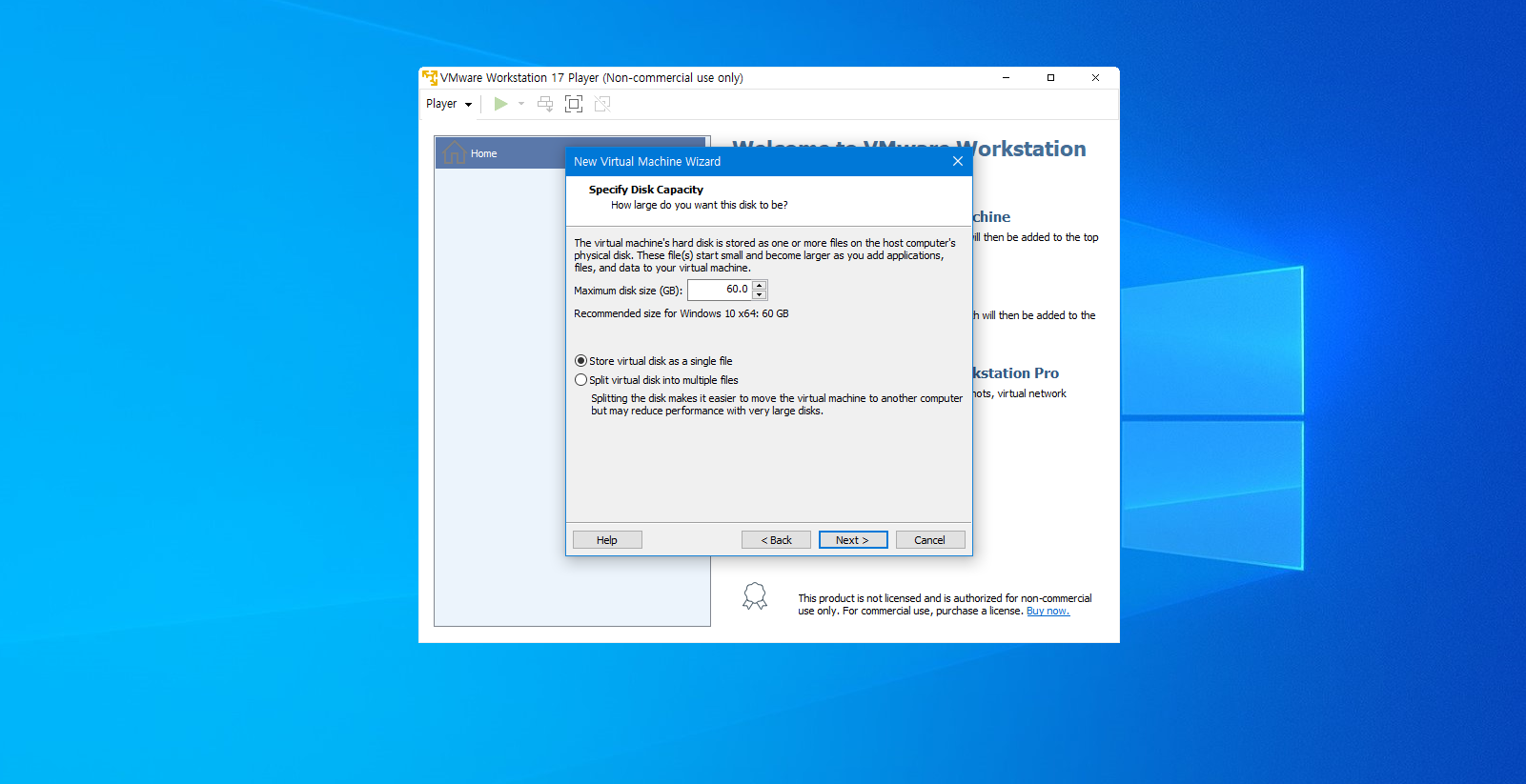 - Split virtual disk into multiple files : 가상 디스크 파일을 여러 파일로 분할하여 생성(VM을 다른 컴퓨터로 옮길 때 유용하나 큰 디스크를 사용하면 성능저하 가능)