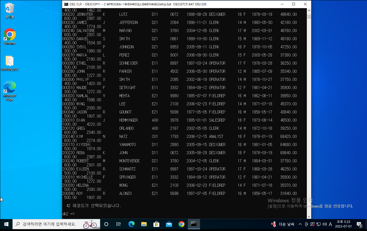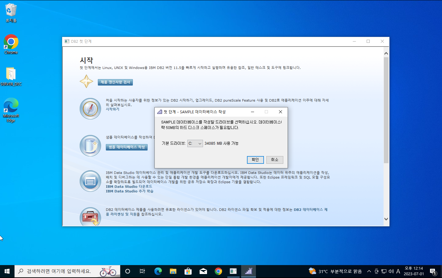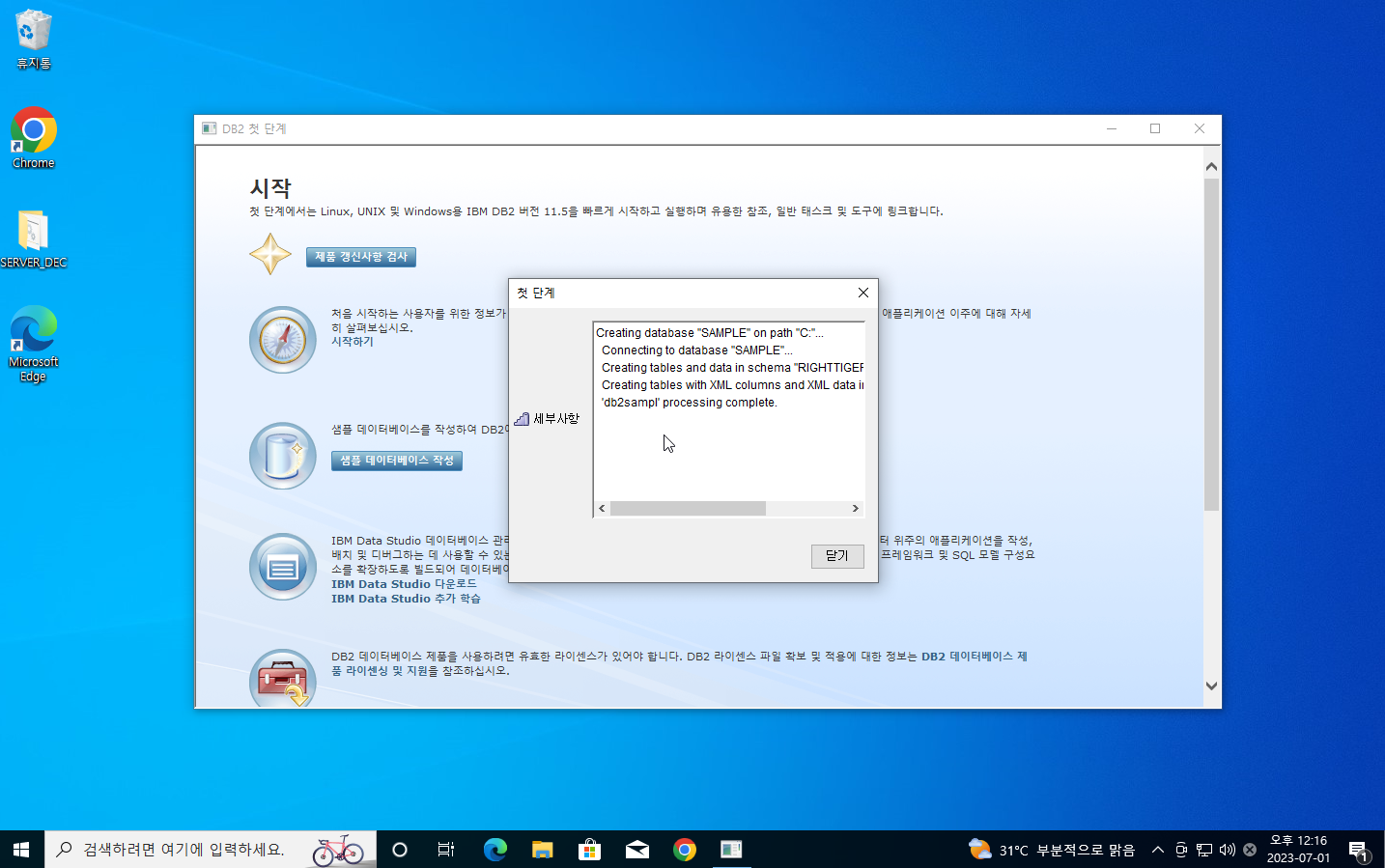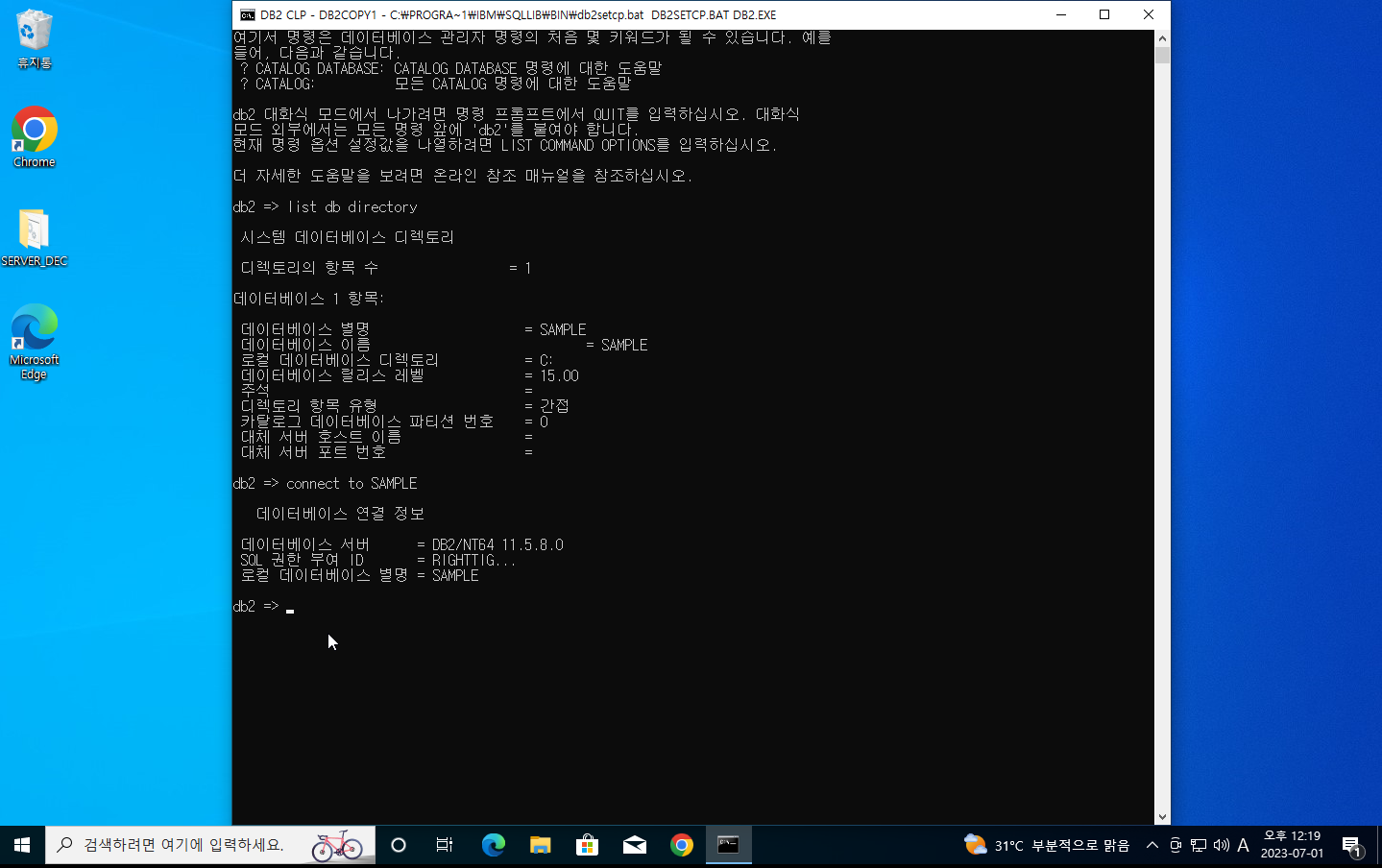 8. 설치가 완료되었으면 DB2 명령행 처리기를 관리자 권한을 실행한 후 SAMPLE DB 생성여부를 확인해준다.