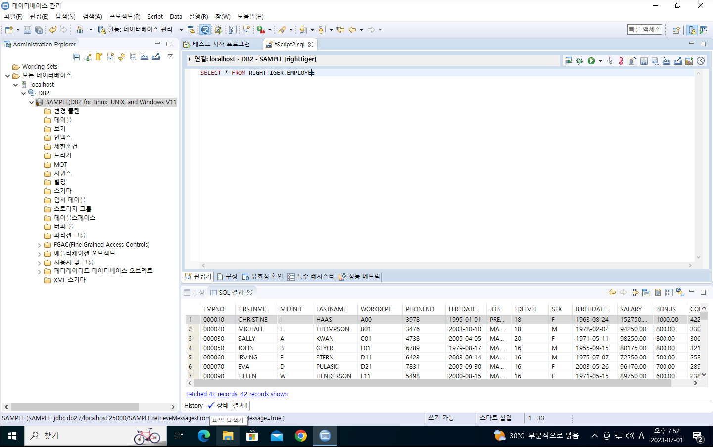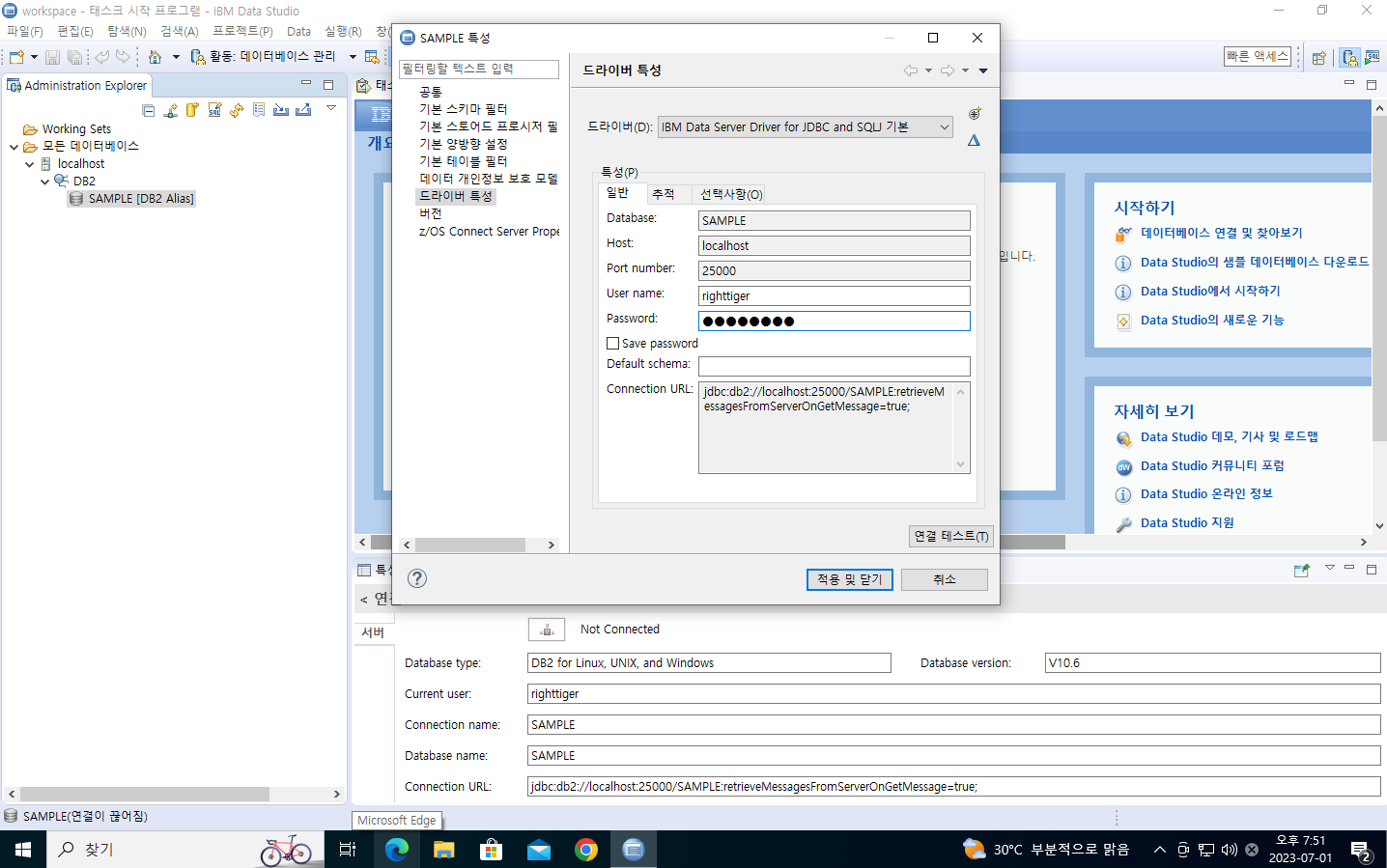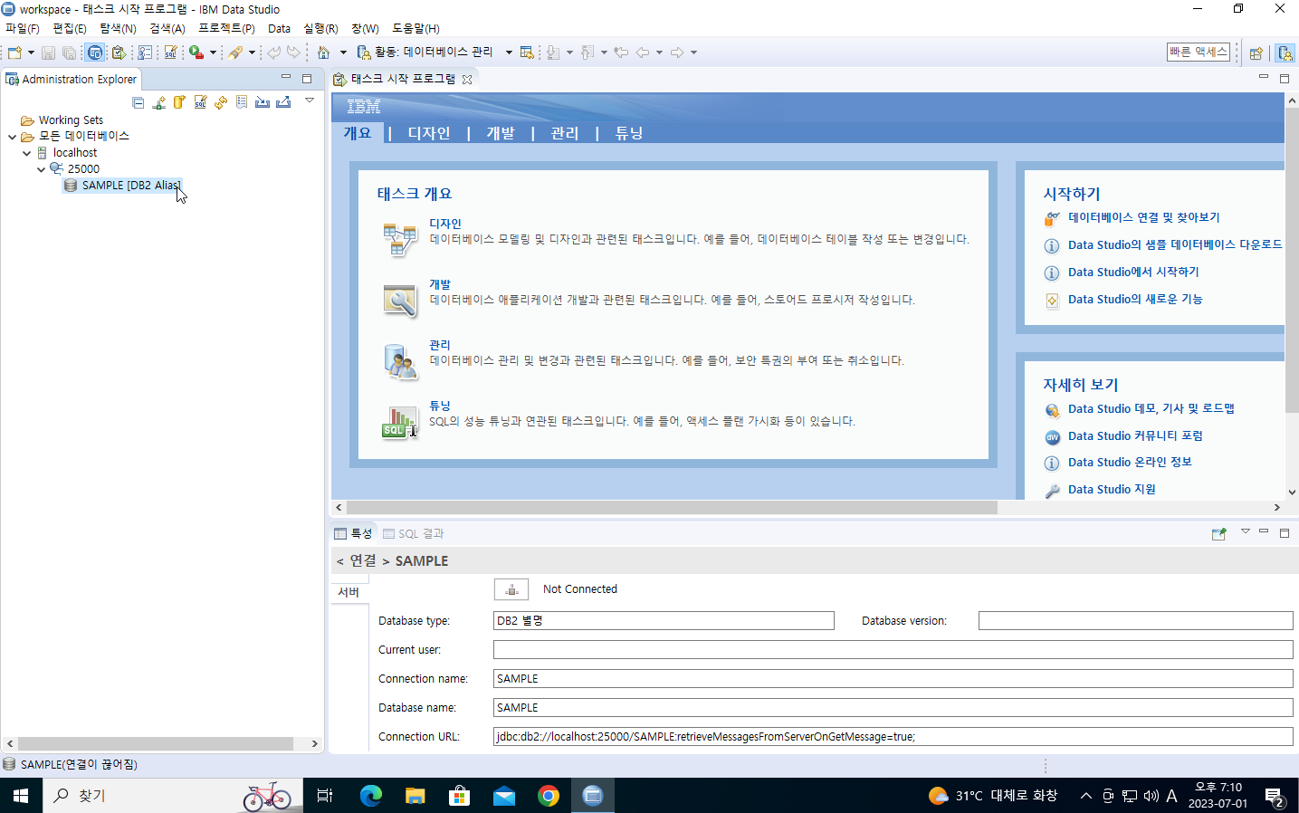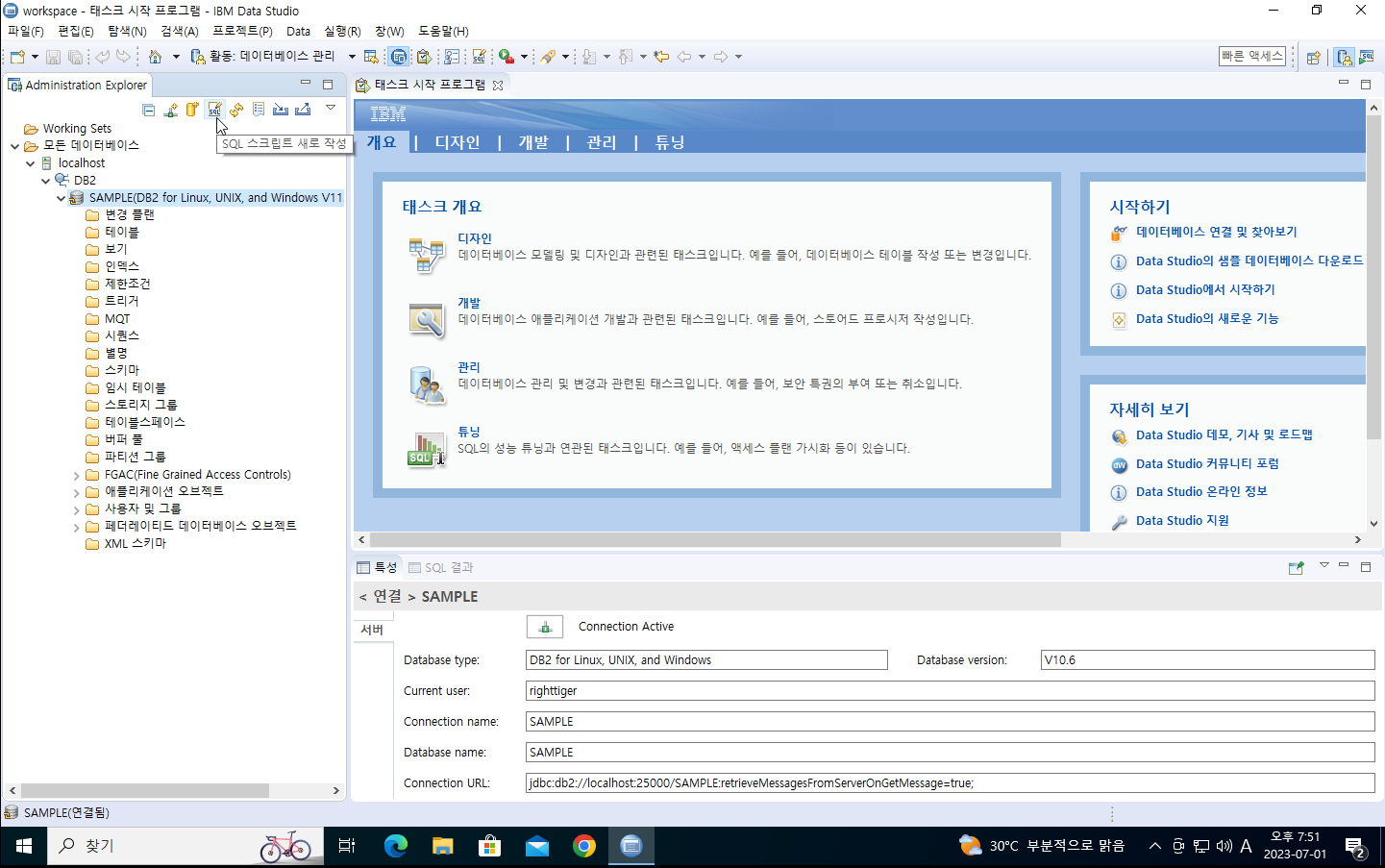 13. 실행이 완료되면 localhost의 SAMPLE DB에 연결한다. 단, 연결시 해당 DB를 생성한 Local 계정으로 접속한다.