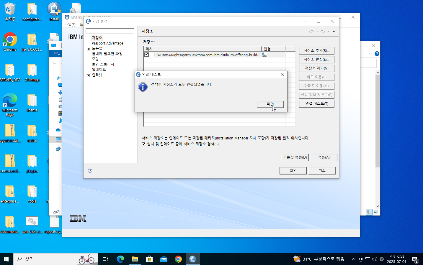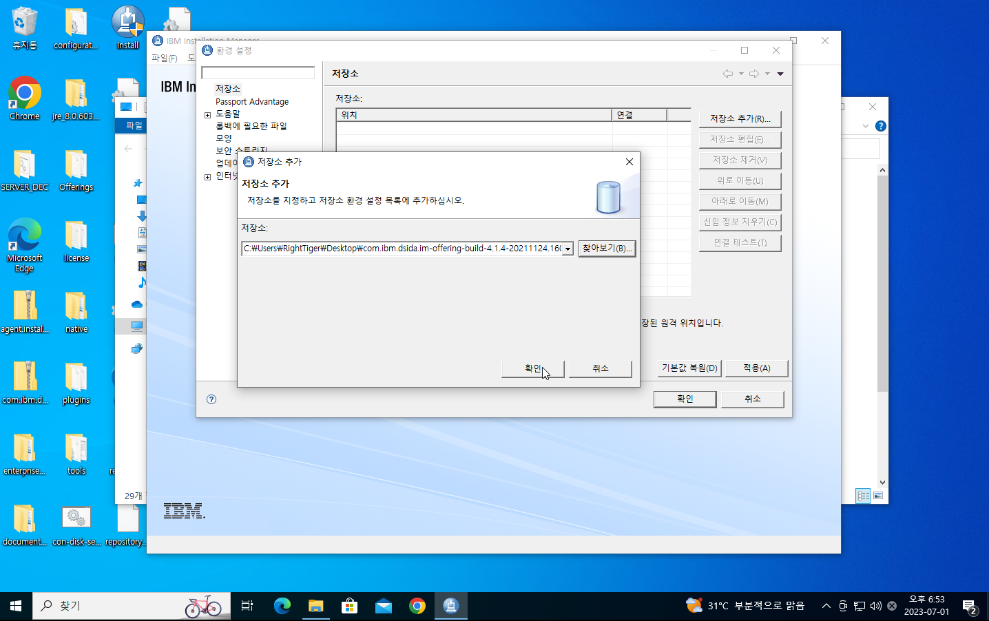 9. 환경설정 창이 나오면 우측의 저장소 추가를 클릭하고 저장소에 com.ibm.dsida.im-offering-build-4.14 압축파일을 추가한다.