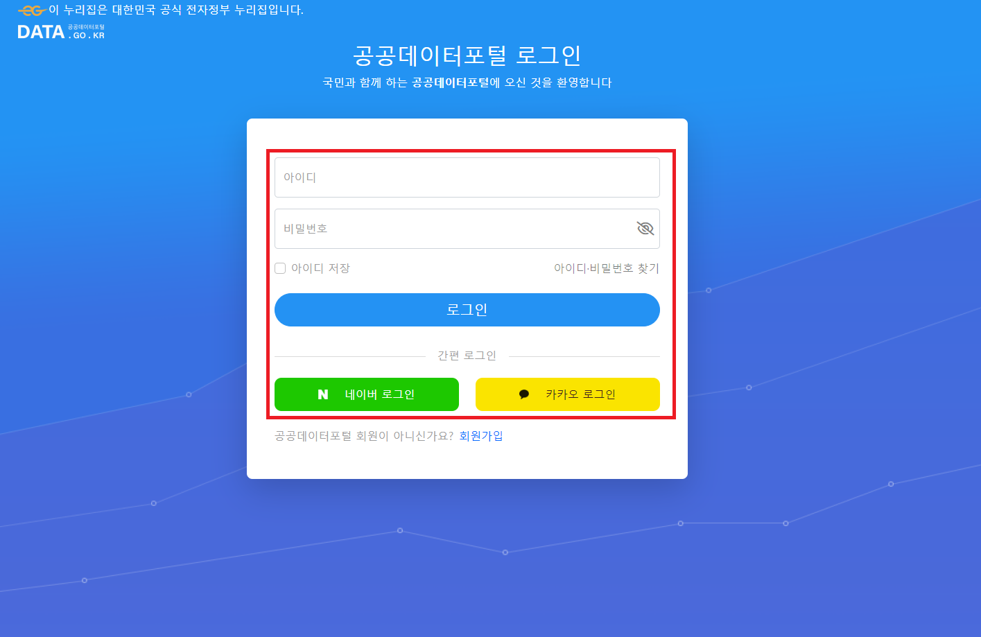 1. 공공데이터 포털 API를 이용하기 위해 회원가입 후 로그인을 합니다.