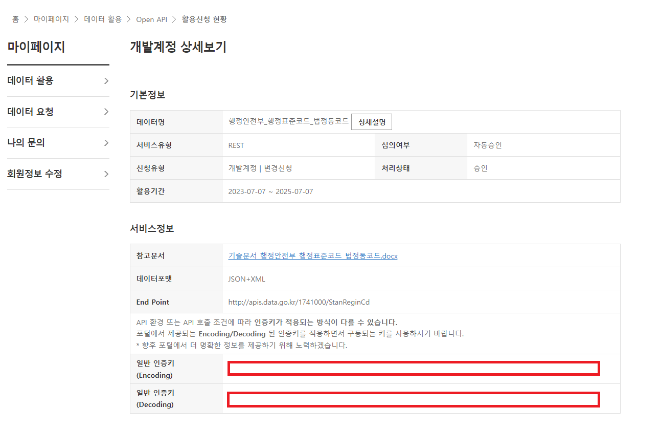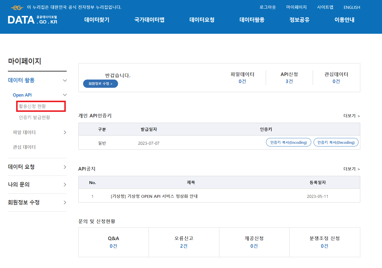 4. 승인이 완료되면 마이페이지-데이터활용-Open API-활용신청 현황으로 들어가 필요한 API를 찾아 클릭합니다.