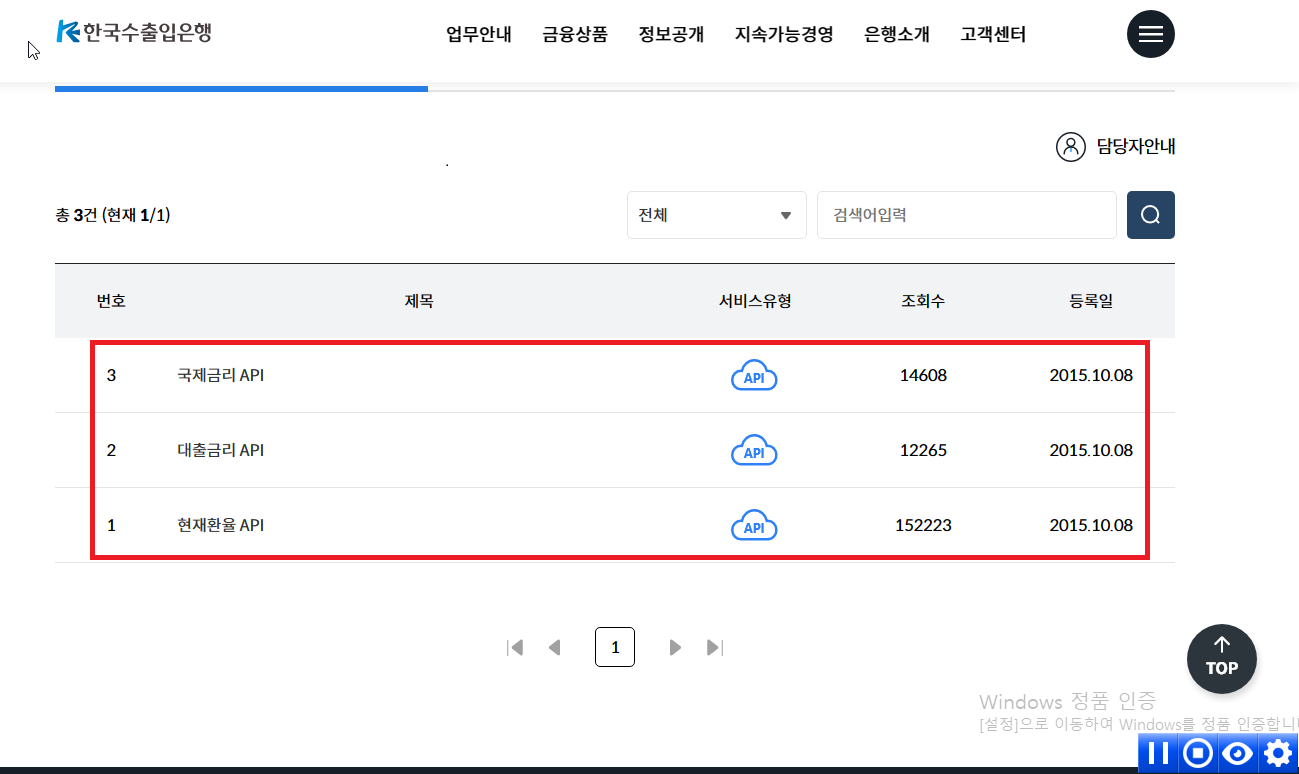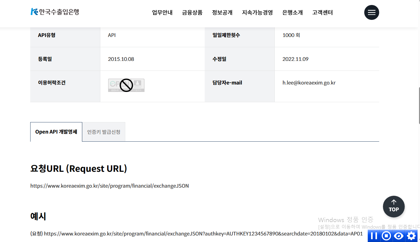 1. 한국 수출입은행이 제공하는 API관련 페이지에 접속합니다.