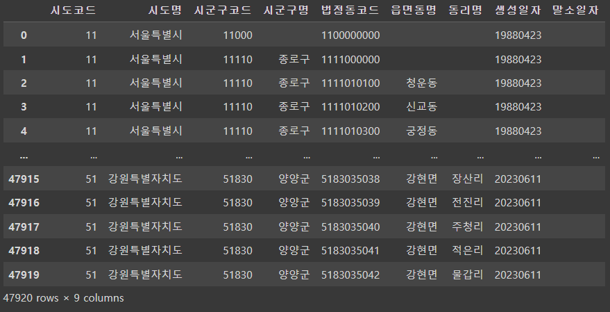 이와 같은 내용이 너무 복잡하다 하시면 법정동, 행정동 코드와 같은 공공데이터들의 일부를 간단하게 사용할 수 있게 만들어진 PublicDataReader라는 라이브러리가 있습니다. 라이브러리 안에 필요한 데이터가 있는 경우 이를 활용하여 간단하게 가공된 데이터를 얻을 수도 있으며, 세부적인 이용방법은 개발자분께서 github를 통해 공개하고 있으니 궁금하신 분들은 아래의 github주소를 참고하여 사용하시면 되겠습니다. 간단하게 Colab에서 이 라이브러리를 사용하면 아래와 같은 결과를 얻으실 수 있습니다.