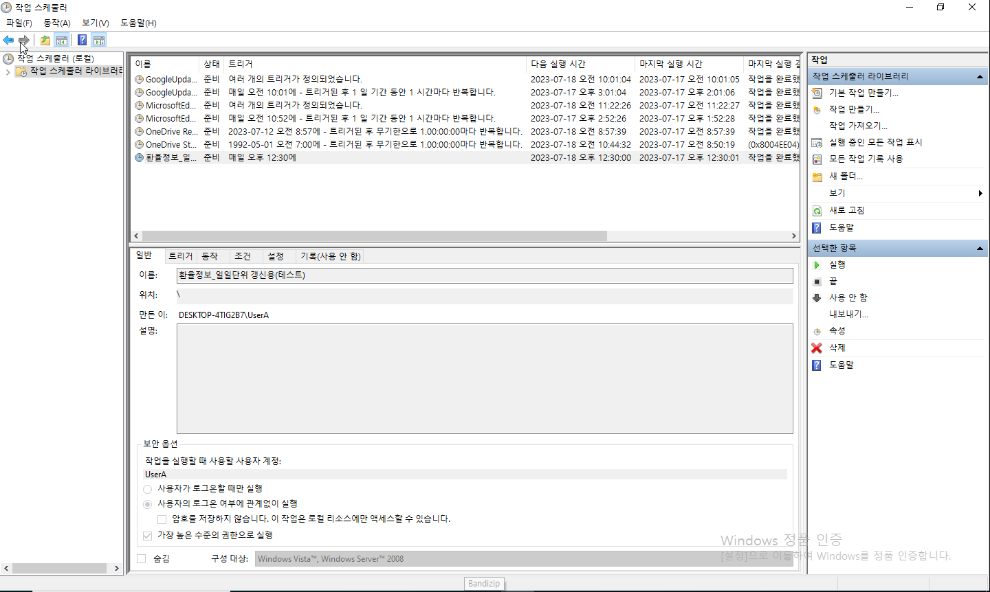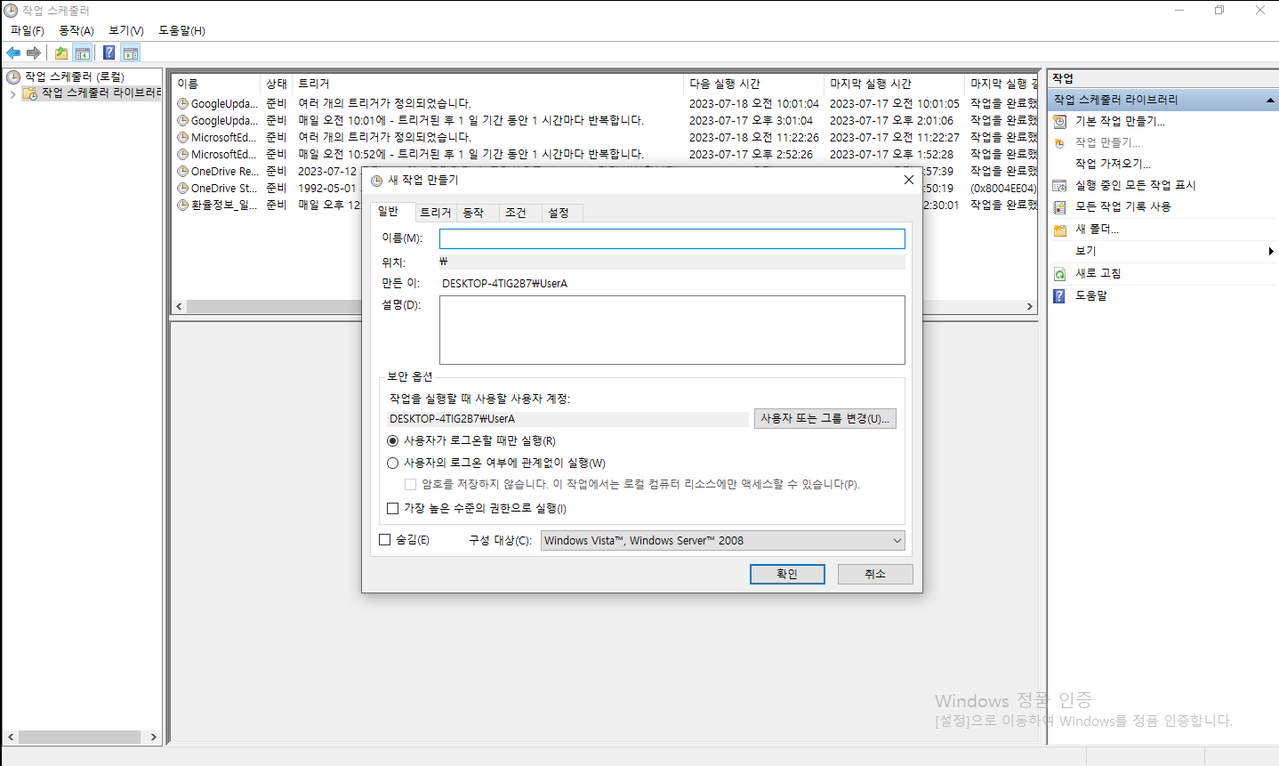 7. Windows작업 스케줄러를 실행시킨 후 해당 bat파일을 실행시킬 수 있는 스케줄을 작성 후 저장합니다.