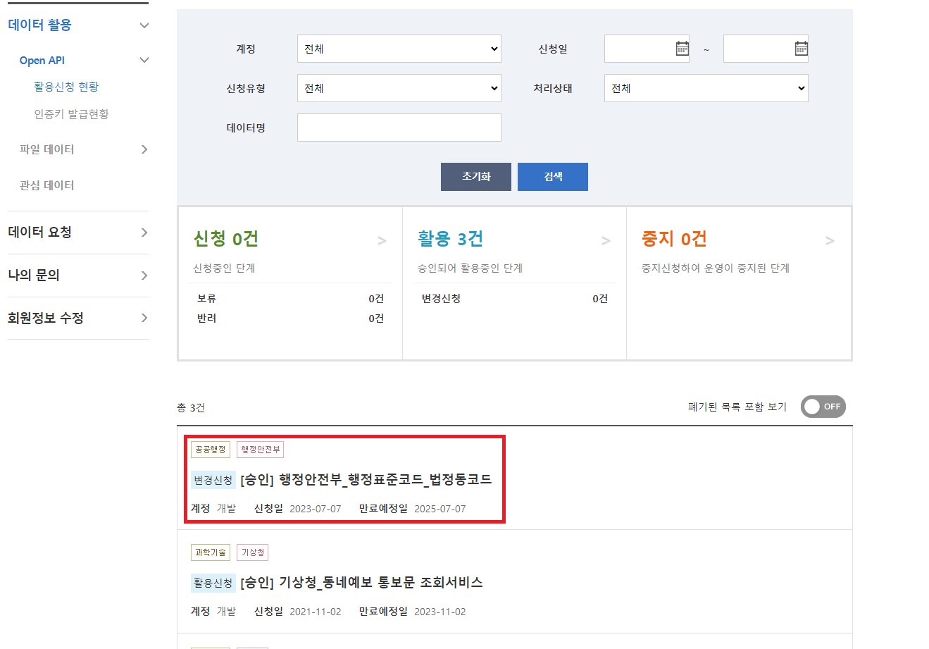 4. 승인이 완료되면 마이페이지-데이터활용-Open API-활용신청 현황으로 들어가 필요한 API를 찾아 클릭합니다.