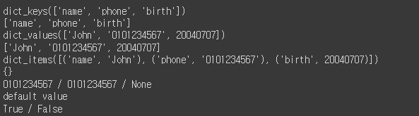 print('phone' in dict_03, 'ph' in dict_03, sep=' / ') # 딕셔너리에 특정값이 있는지 확인