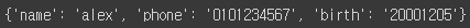 dic_ex = {'name':'alex', 'phone':'0101234567', 'birth':'20001205'}