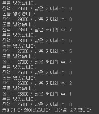 print('커피가 다 떨어졌습니다. 판매를 중지합니다.')