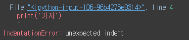 ㆍpython은 if문을 적용할 범위를 들여쓰기로 구분하기에 해당 부분을 반드시 맞춰줘야 하며, 들여 쓰기는 spacebar로 해도 되고 tab으로 해도 되지만 두 개를 혼용해서 쓰면 오류발생확률이 올라가므로 한 가지로 맞춰서 작성하는 것이 바람직함.