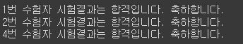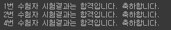 print(f'{number}번 수험자 시험결과는 합격입니다. 축하합니다.')