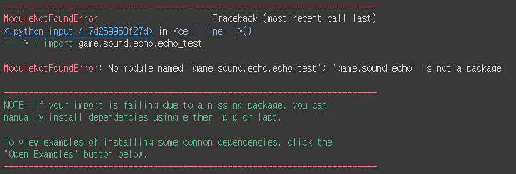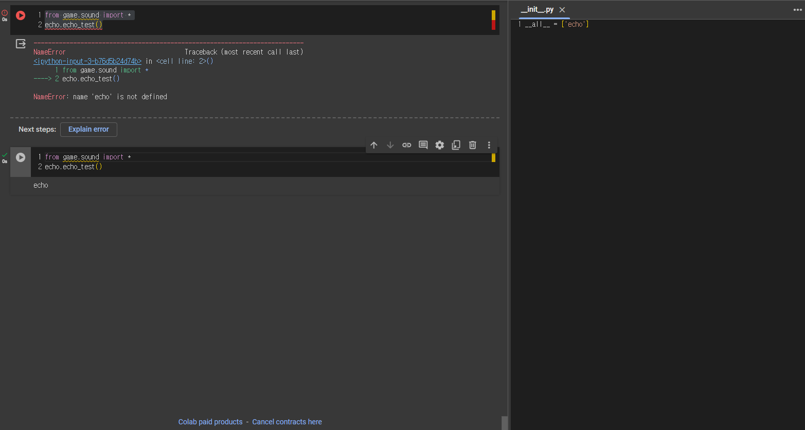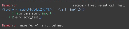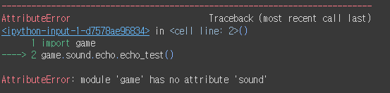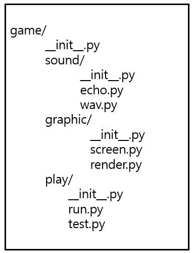 ㆍ__init__.py를 작성하지 않고 game 패키지만 import 해서 사용하려고 하면 에러가 발생함. __init__.py 파일은 해당 디렉터리가 패키지의 일부임을 알려주는 역할을 하며 패키지에 포함된 디렉터리에 __init__.py 파일이 없으면 패키지로 인식되지 않음. 추가적으로 from~import가 아니라 import만 할 경우에는 반드시 마지막 항목은 모듈 또는 패키지 여야함.