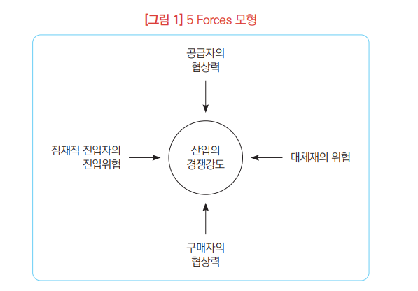 ㆍ마이클 포터가 제시한 산업구조 분석 기법으로, 5가지 경쟁요인(수평 3개, 수직 2개)에 의해 산업의 매력도와 수익률이 결정된다고 보는 모형.
