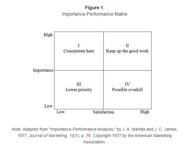 ㆍ일련의 과제들에 대한 전략적 우선순위를 결정하는 모형으로 IPA(Importance-Performance Analysis) 모형은 과제들의 상대적 중요성과 현재 수행 수준이라는 2가지 축이 교차하는 사분면 상에서 분석을 진행함. 분석 결과를 토대로 유지관리, 중점개선, 투입축소 등의 우선순위 도출을 위한 시사점을 탐색함.