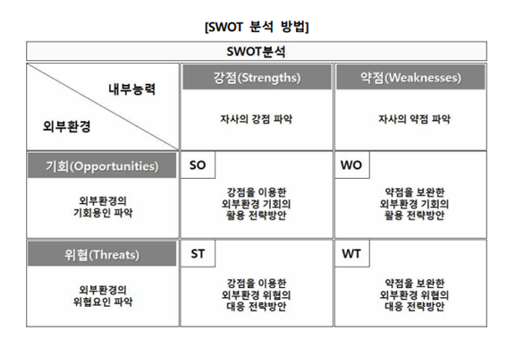 ㆍSWOT 분석 : 환경 측면의 기회(Opportunity)와 위협(Threat), 역량 측면의 강점(Strength)과 약점(Weakness) 분석