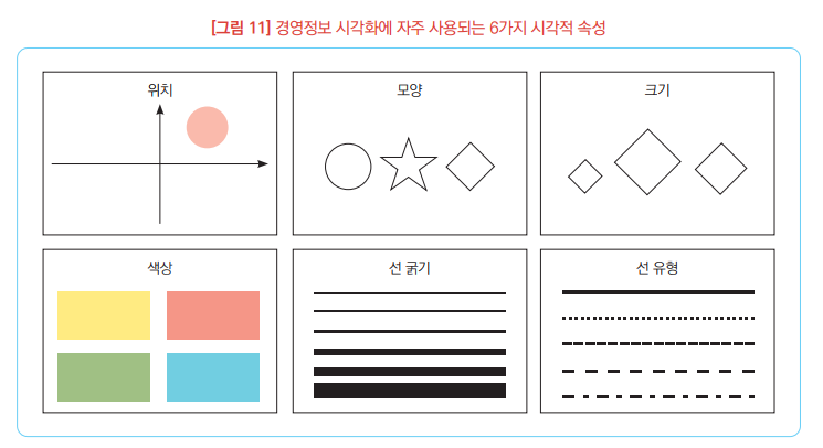 ▶ 경영정보시각화에서는 위치, 모양, 크기, 색상, 선 굵기, 선 유형의 6가지 유형이 자주 사용됨.