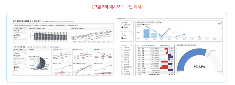 ㆍ대시보드: 데이터의 시각적 표시를 통해 상황을 모니터링하고 이해하는 데 도움을 주는 도구로, 화면에 여러 시각화 요소(개체)를 배치하여 데이터를 쉽게 탐색할 수 있는 디자인을 가짐.