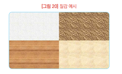 | 텍스처 변화 | 요소의 질감이나 표면의 변화로 텍스처의 부드러움, 거칠기, 광택 등을 조절하여 디자인에 색다른 시각적인 경험을 줄 수 있음. |
