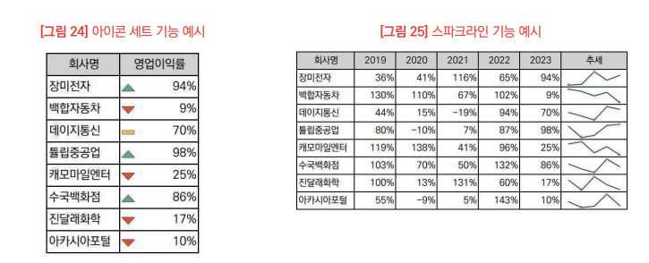 ㆍ그래프 및 차트: 선, 막대, 원 그래프와 같은 차트 형식을 사용하여 데이터 시각화를 진행하며 데이터의 비교, 추세 파악, 관계 등을 시각적으로 보여줌.