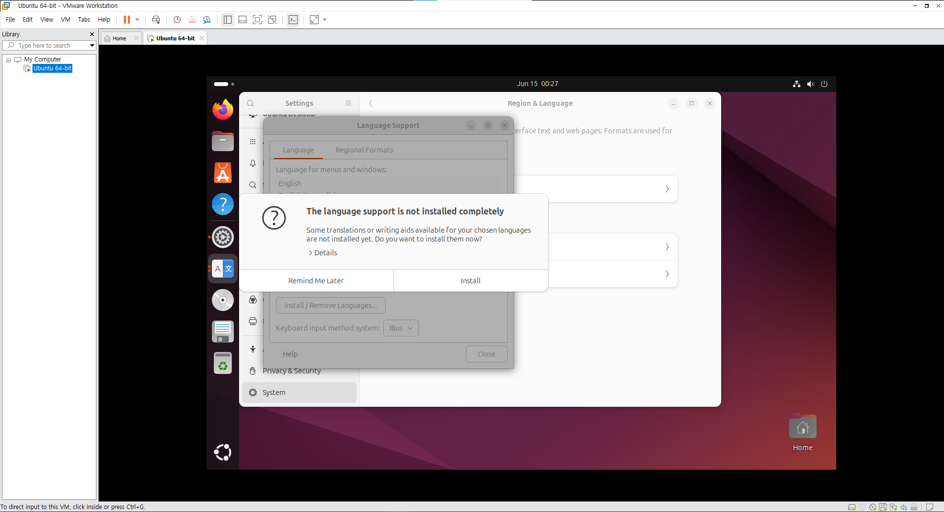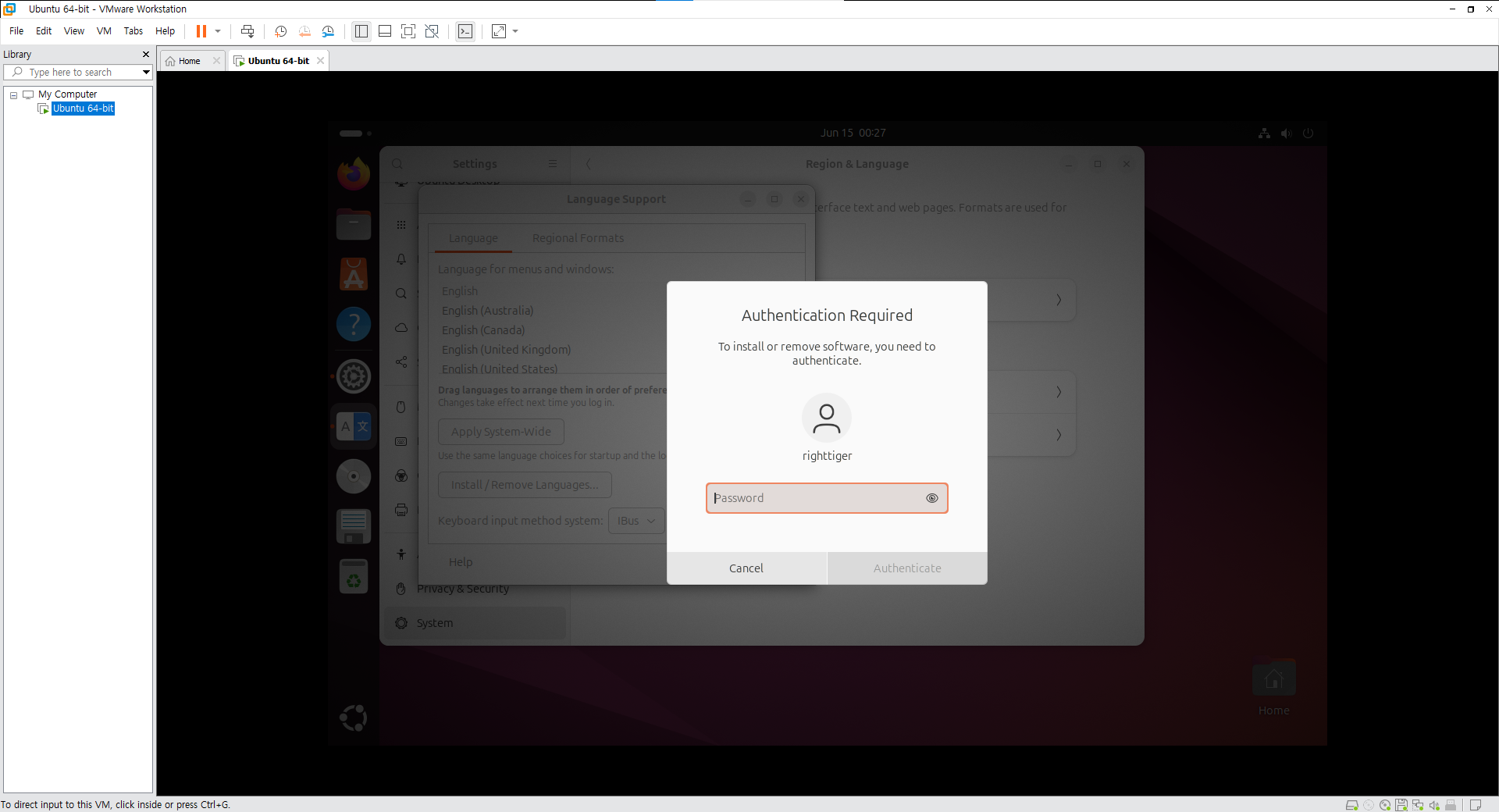 4. [System]-[Region&Language]-[MangeInstalled Languages] 메뉴 클릭 후 최초 뜨는 Install 안내메시지에서 Install을 클릭한다.(설치 시 Ubuntu 최초 설치시 생성한 계정의 패스워드 입력 필요)