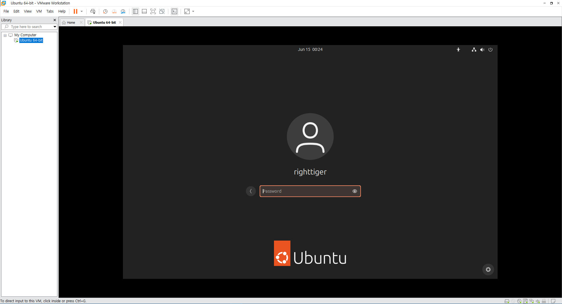 2. 재시작 시 로그인 화면이 뜨는데 Ubuntu 설치 시 생성한 계정과 패스워드를 이용하여 접속한다.