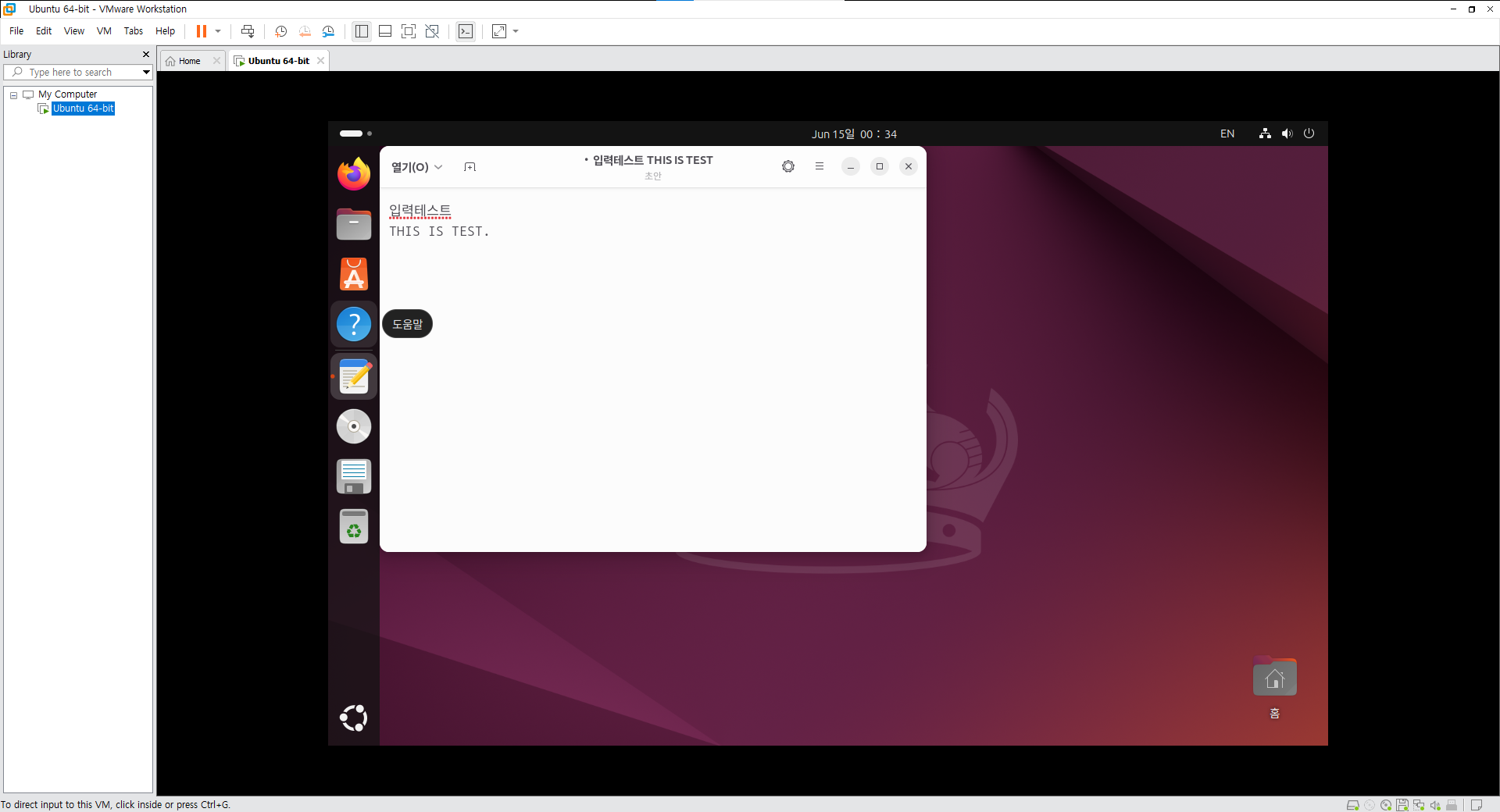 10. 상단 메뉴바의 현재언어를 가리키는 메뉴를 클릭 후 한글 상태로 한번 변경해 주고 텍스트 편집기를 실행하여 한글과 영어가 둘 다 잘 입력되는지 확인한다.(shift+space로 한/영 전환 가능)