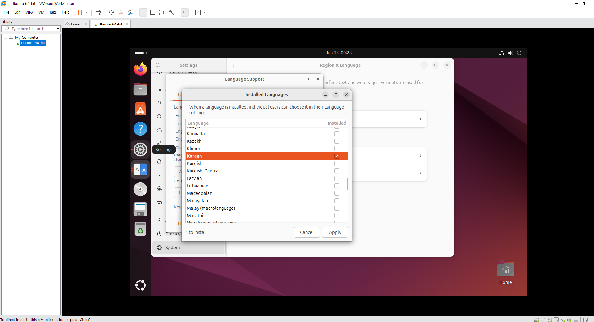 5. 설치 후 하단의 Install/Remove Languages를 클릭 후 Korean을 찾아 클릭하고 Apply를 클릭한 하여 설치를 진행한다.